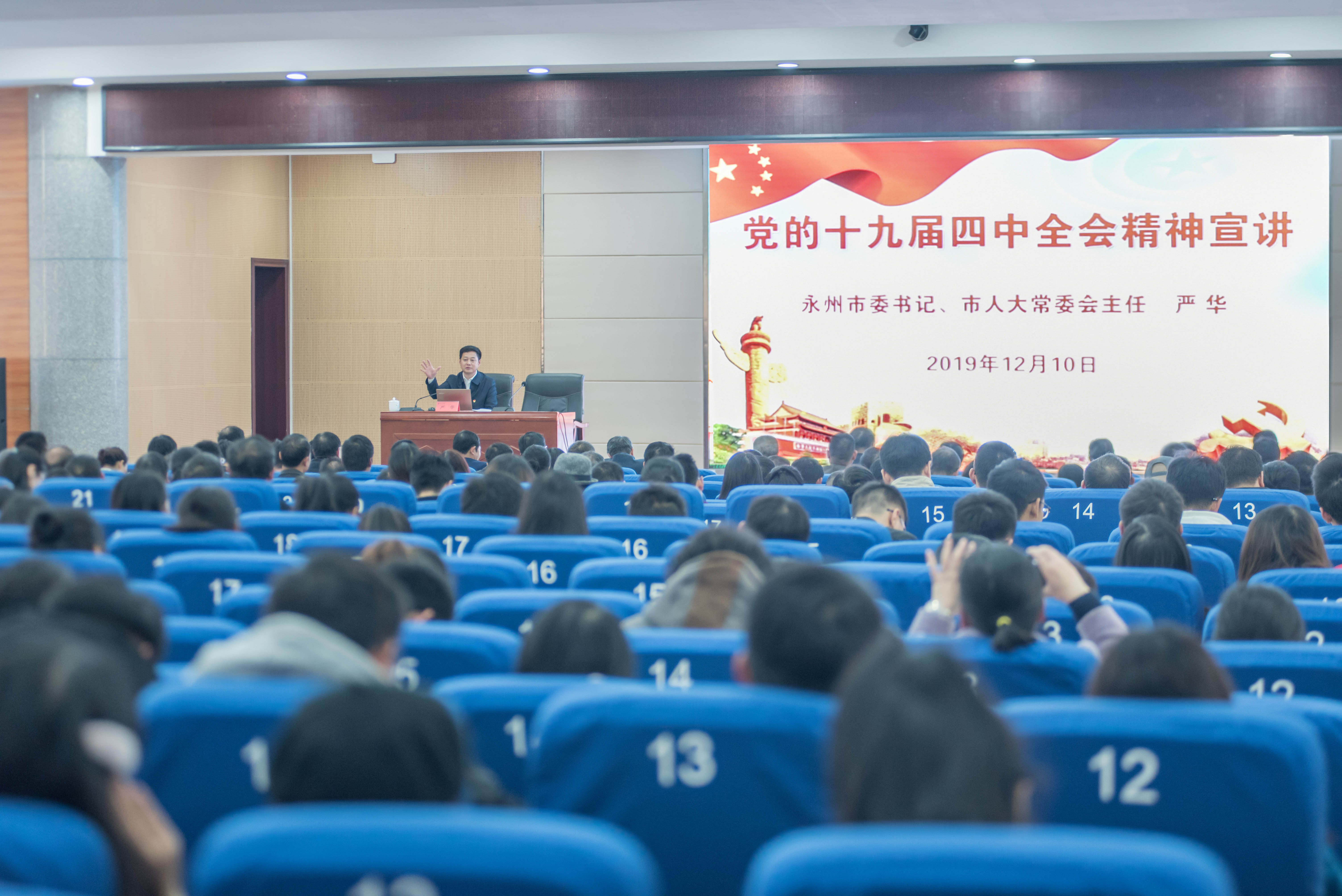 12月10日下午,省委宣讲团来校宣讲十九届四中全会精神。省委宣讲团成员、永州市委书记、市人大常委会主任严华作宣讲报告。市委常委、市委秘书长唐能武出席,党委书记曾宝成主持报告会,校长李钢,校领导唐艳明、宋宏福、彭立威、李常健、吴小林、程智开和600余名师生代表参加报告会。