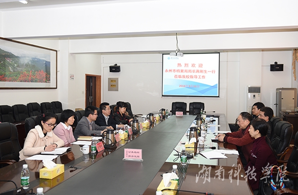 本网讯(记者 黄宇婷 摄影 何帅文)3月31日下午,永州市档案局局长蒋刚生一行来校调研档案工作,校长曾宝成热情接待。
