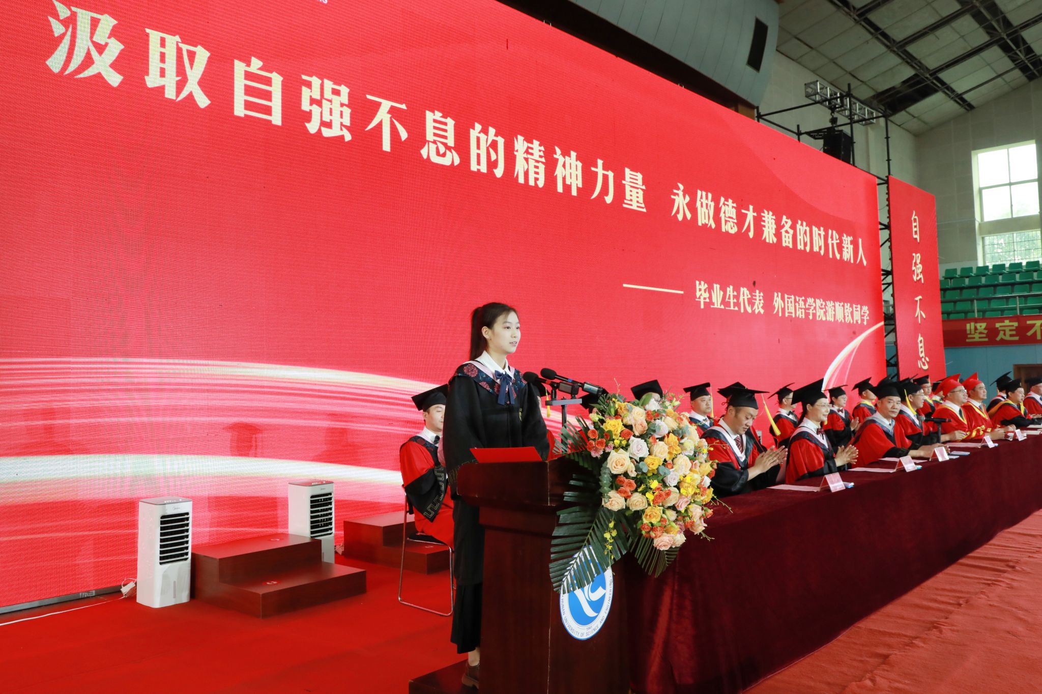 毕业典礼在雄壮嘹亮的国歌声中拉开帷幕。