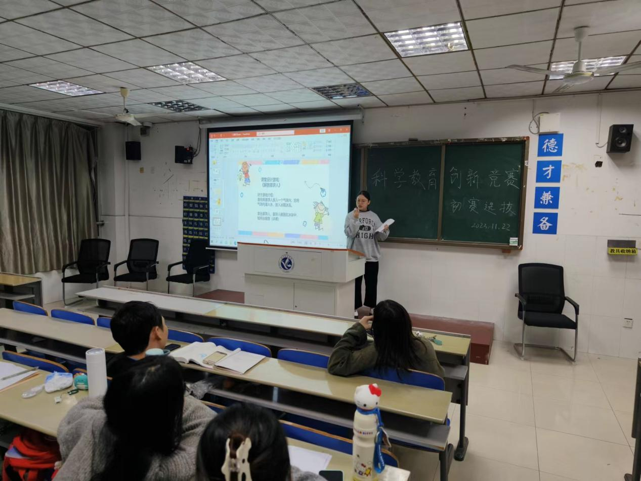 本网讯(曹颖 廖阳 林颖君)为深入贯彻习近平总书记“在教育‘双减’中做好科学教育加法”的指示,选拔优秀选手参加湖南省科学教育创新竞赛。11月26日上午9:00,化学与生物工程学院于逸夫楼323进行了2023年8868官方网站科学教育创新竞赛的初赛。本次比赛由廖阳老师和曹颖老师担任评委,参赛选手主要来自化学师范和生物技术师范两个专业,参赛方向为教学设计和教具设计两方面。