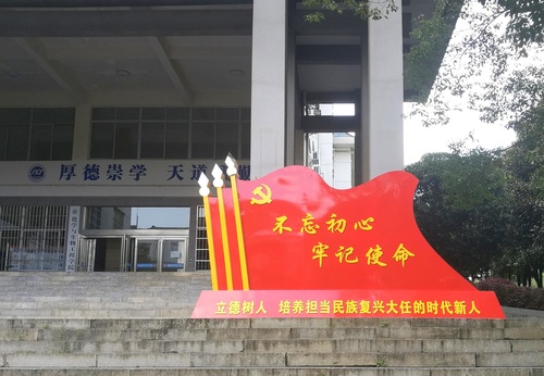 党旗雕塑的红色党旗上书“不忘初心,牢记使命”,底座上写有“立德树人,培养担当民族复兴大任的时代新人”字样。三面党建文化墙红底白字,朴素大方,将社会主义核心价值观、“四有”好老师和习近平总书记在纪念五四运动一百周年大会上对青年学生提出的六点期望等内容简单明了地展现在师生面前,潜移默化地起到涵养作用。