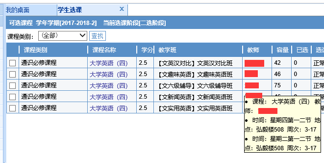 二、进入选课系统选课,点击左侧“信息管理”——“学生选课”,显示可选课程及班级名。光标悬停在班级名所在列即可查看该分项上课时间、地点和任课教师等信息。