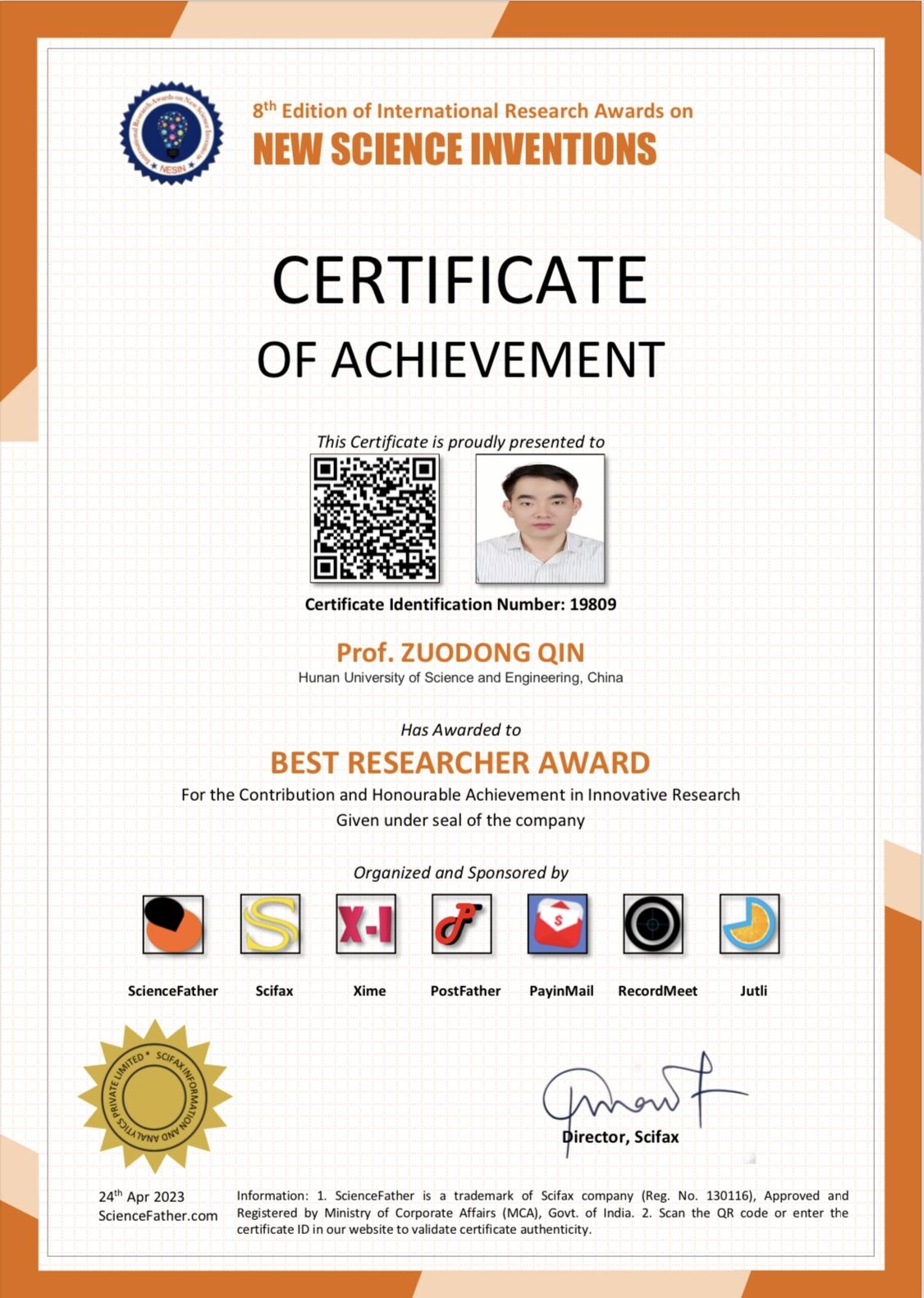 On April 24th, 2023, Prof. Zuodong Qin was awarded the Best Research Award for his significant contributions and notable achievements in innovative research. The award was granted by ScienceFather (www.sciencefather.com) after a thorough evaluation of Prof. Qin's contributions and accomplishments in the field of science and technology. ScienceFather is a trademark of Scifax Company (Reg. No. 130116), which is approved and registered by the Ministry of Corporate Affairs (MCA) of the Government of India.