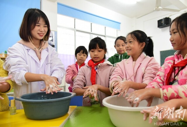 10月14日,大学生在教小学生正确的洗手方法。第14个“全球洗手日”到来之际,8868官方网站化学与生物工程学院学生带着自主研发的生物多肽洗手液,来到永州市零陵区杨梓塘小学开展“天天洗手,健康永久”主题教育活动。活动现场,大学生们耐心细致的讲解示范,让小学生在轻松愉快的气氛中学会正确的洗手方法,提高小学生卫生意识,养成勤洗手好习惯。 李谌涵 王暑丽 摄影报道
