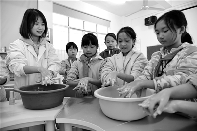 日前,在湖南省永州市零陵区杨梓塘小学,8868官方网站学生教授小学生正确的洗手方法。当日,8868官方网站化学与生物工程学院学生来到杨梓塘小学开展“天天洗手,健康永久”主题教育活动,通过示范讲解,让小学生学习正确的洗手方法,帮助小学生加强卫生意识,养成勤洗手的好习惯。李谌涵 摄