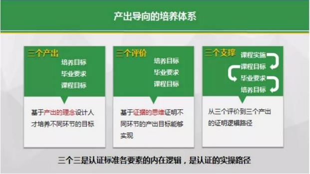 “三个三”指产出导向的培养体系中“三个产出、三个评价、三个支撑”,是师范认证标准各要素的内在逻辑,是认证的实操路径。