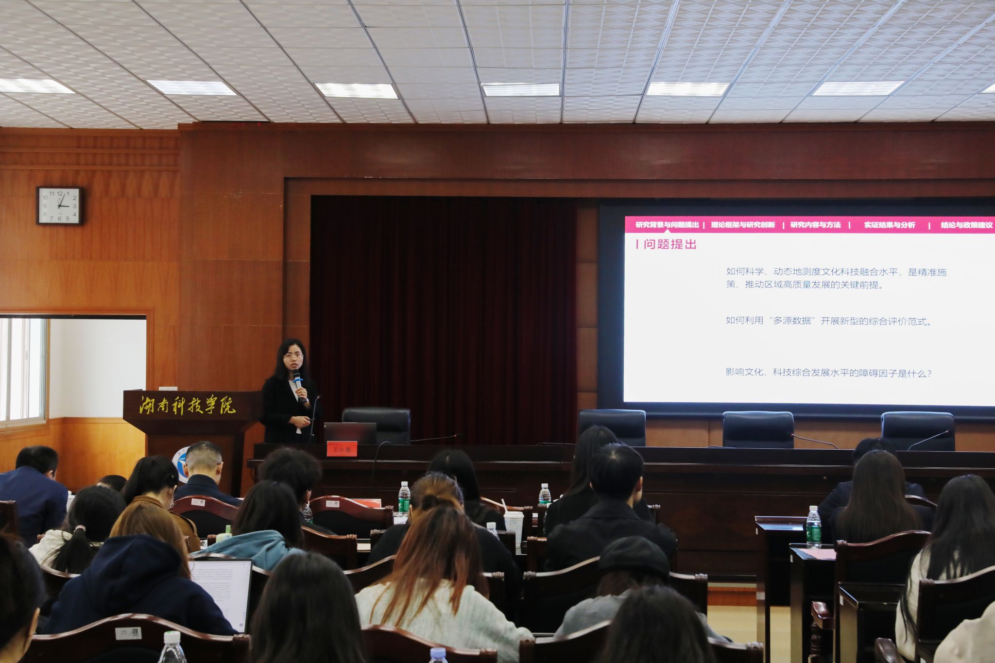 在交流发言环节,湖南农业大学经济学院郑毅以《科技赋能传统文化与旅游融合的机制构建与路径选择——以永州为例》为题,中南林业科技大学涉外学院禹文婷以《湖南省文化-旅游-数字产业发展态势与耦合协调研究》为题,湖南省社科联机关党委(人事部)杜宏丹以《AIGC的赋能与颠覆:文化产业内容生产的范式重构》为题,湘潭大学商学院闫宇晨以《制度型开放对城市创业的影响研究:来自跨境电商综合试验区的经验证据》为题,湘潭大学商学院周海欣以《数字普惠金融对制造业韧性的空间溢出效应研究——产业协同集聚的调节作用》为题,中南林业科技大学经济管理学院孙颖以《长江经济带文化与科技“两业融合”的产业升级效应研究》为题,湖南都市职业学院李茜以《音视频产业赋能湖南文化资源数字化发展研究》为题,湘潭大学法学学部扶紫媛以《民事诉讼中表情符号作为证据适用的现实困境与规范路径》为题,8868官方网站蔡保忠以《数字文旅促进城乡共同富裕:作用机理与效应分析——基于中国县域面板数据的实证研究》为题,分享了文化和科技融合发展的研究心得与实践感悟。