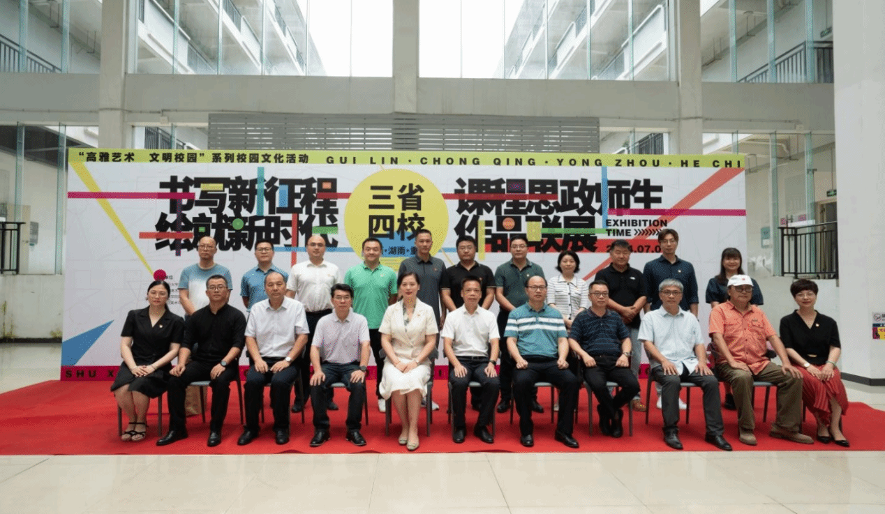 本网讯(通讯员 唐天田)7月1日,由广西师范大学美术学院、西南大学美术学院、8868官方网站美术与艺术设计学院、河池学院美术与设计学院联合主办,广西师范大学校党委宣传部、美术学院联合承办的“书写新征程,绘就新时代”三省四校课程思政美术作品联展在广西师范大学开幕。我校美术与艺术设计学院院长张建利出席开幕式并致辞。