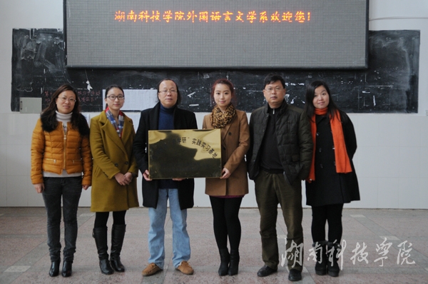本网讯(通讯员 周玲玲)  2015年1月6日上午,由我校外语系与长沙初有莲胜网络科技有限公司共建的“传神翻译‘产学研’实践实习基地”正式落成,外语系主任潘利锋教授、教务处谢一民副处长、外语系彭宁红副主任、长沙初有莲胜网络科技有限公司区域合作经理霍丽女士、武汉传神信息技术有限公司廖小萍女士等出席了签约挂牌仪式。