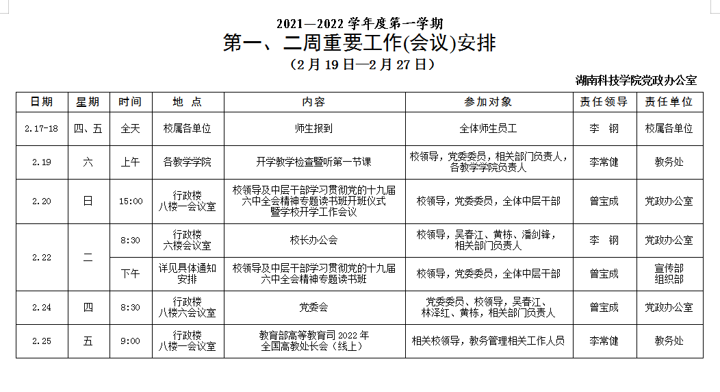 [党政办]2021—2022 学年度第一学期 第一、二周重要工作(会议)安排