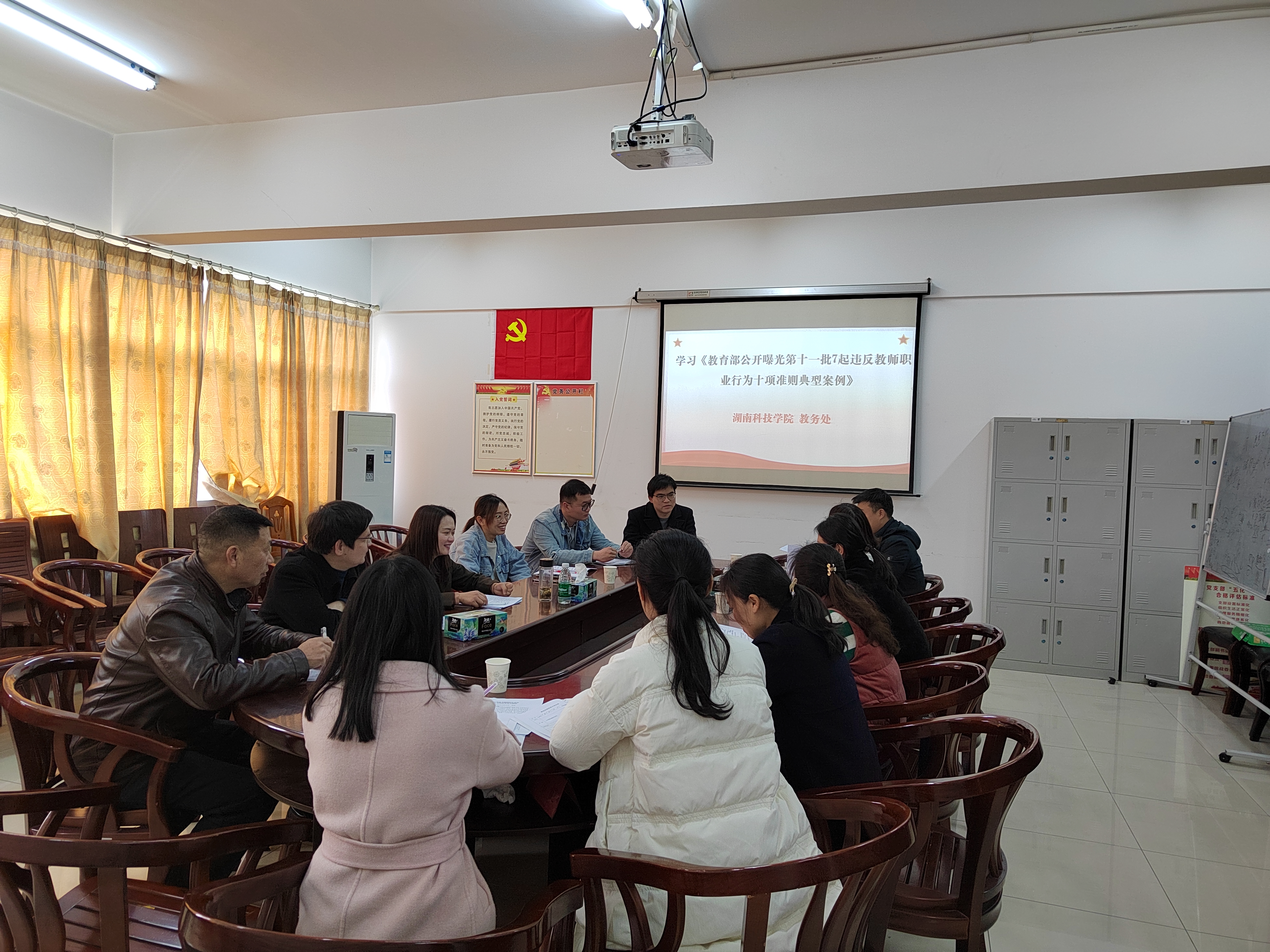 为深入贯彻落实教育部《新时代高校教师职业行为十项准则》(教师〔2018〕16号)和《教育部关于高校教师师德失范行为处理的指导意见》(教师〔2018〕17号)文件精神,进一步加强师德师风建设。2月27日下午,教务处组织全体教职工集中学习《教育部公开曝光第十一批7起违反教师职业行为十项准则典型案例》,以案为镜、以案肃纪,教育引导广大教务工作者严格遵守师德规范,自觉加强师德修养,坚持做以德立身、以德立学、以德施教、以德育德的楷模,维护教师职业形象,提振师道尊严。