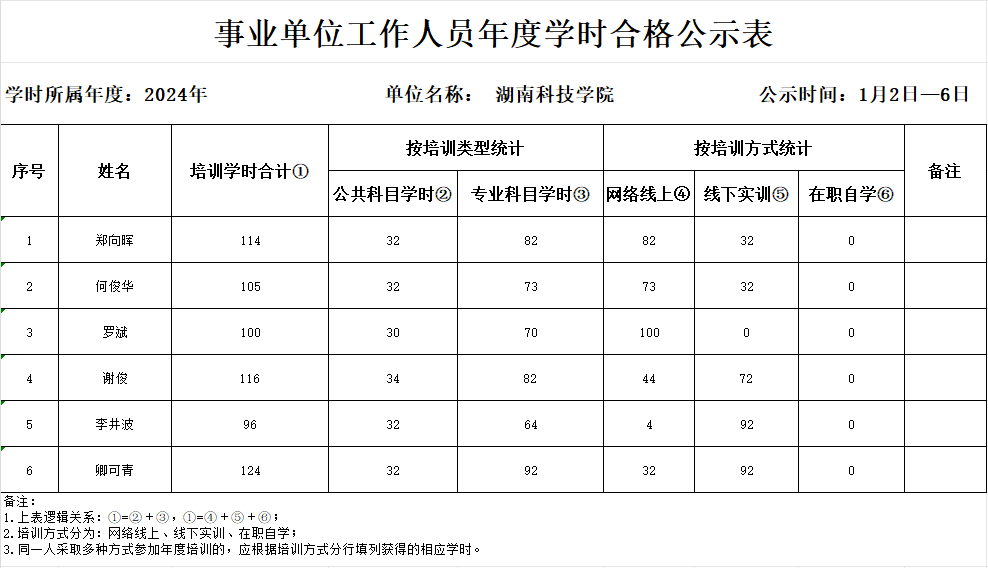 根据《关于做好我校2024年度事业单位工作人员培训工作的通知》要求,经个人填报,部门审核,现将我处2024年事业单位培训学时情况予以公示,公示时间为2025年1月2日—6日,如有异议,请在公示期内向725办公室反馈。