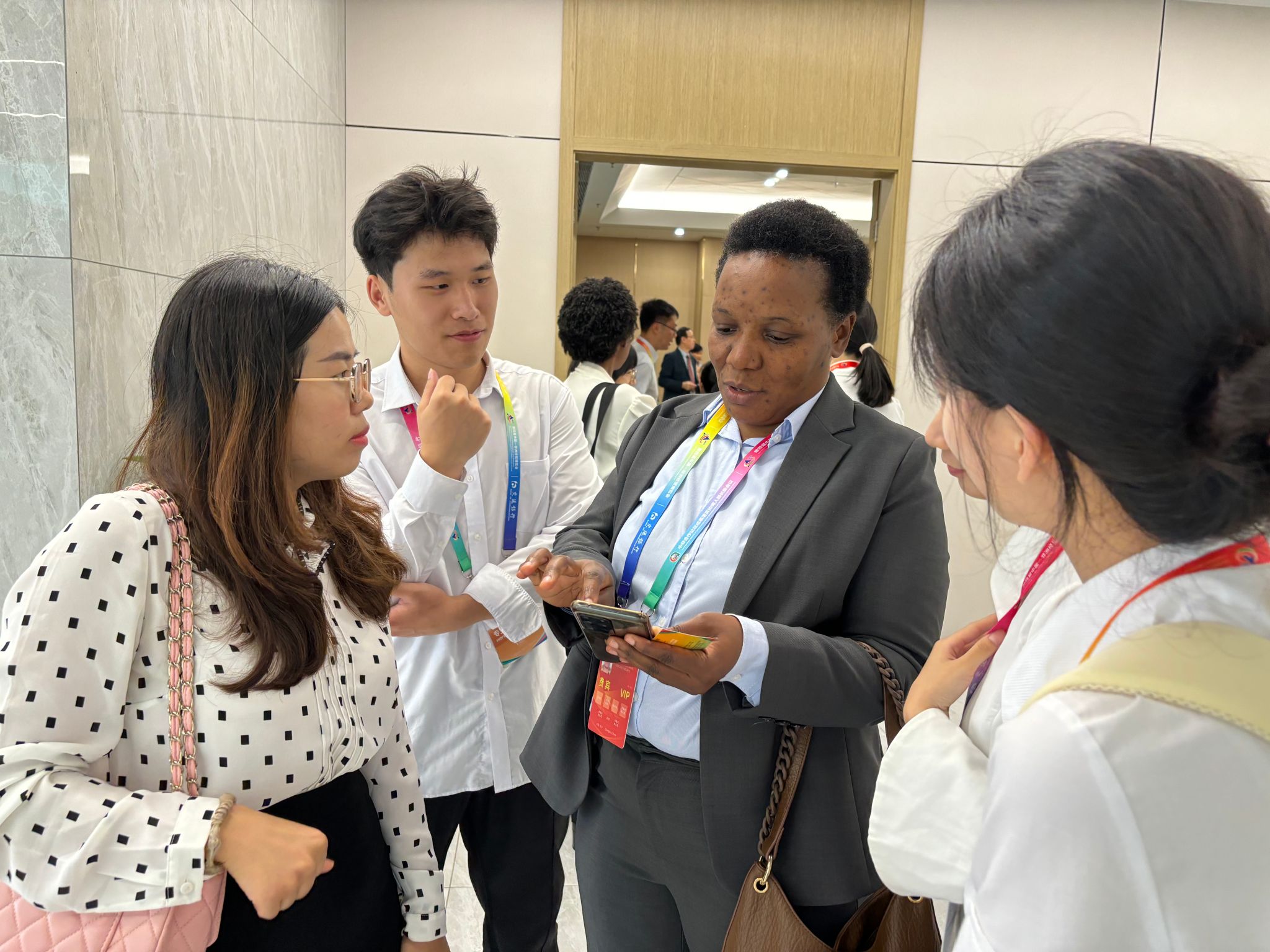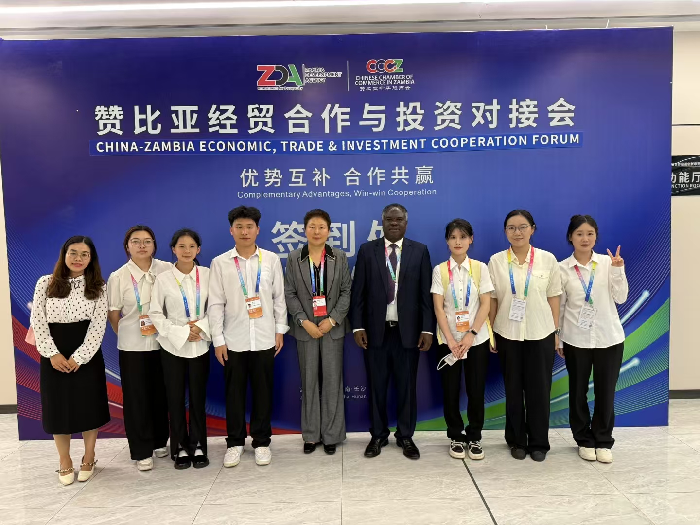 本网讯(通讯员 黄雅丽)6月12日至13日,我校53名师生赴长沙参加第四届中非经贸博览会,圆满完成“湘商——中非经贸促进专场对接会”“赞比亚经贸合作与投资对接会”等会议保障任务。团队充分发挥专业特长,负责会务议程(含嘉宾主旨发言)文本翻译、与会外宾现场口译、重点贵宾一对一翻译、会议现场礼仪引导及志愿服务等工作,以精湛的专业素养和热情的服务精神赢得了广泛赞誉。