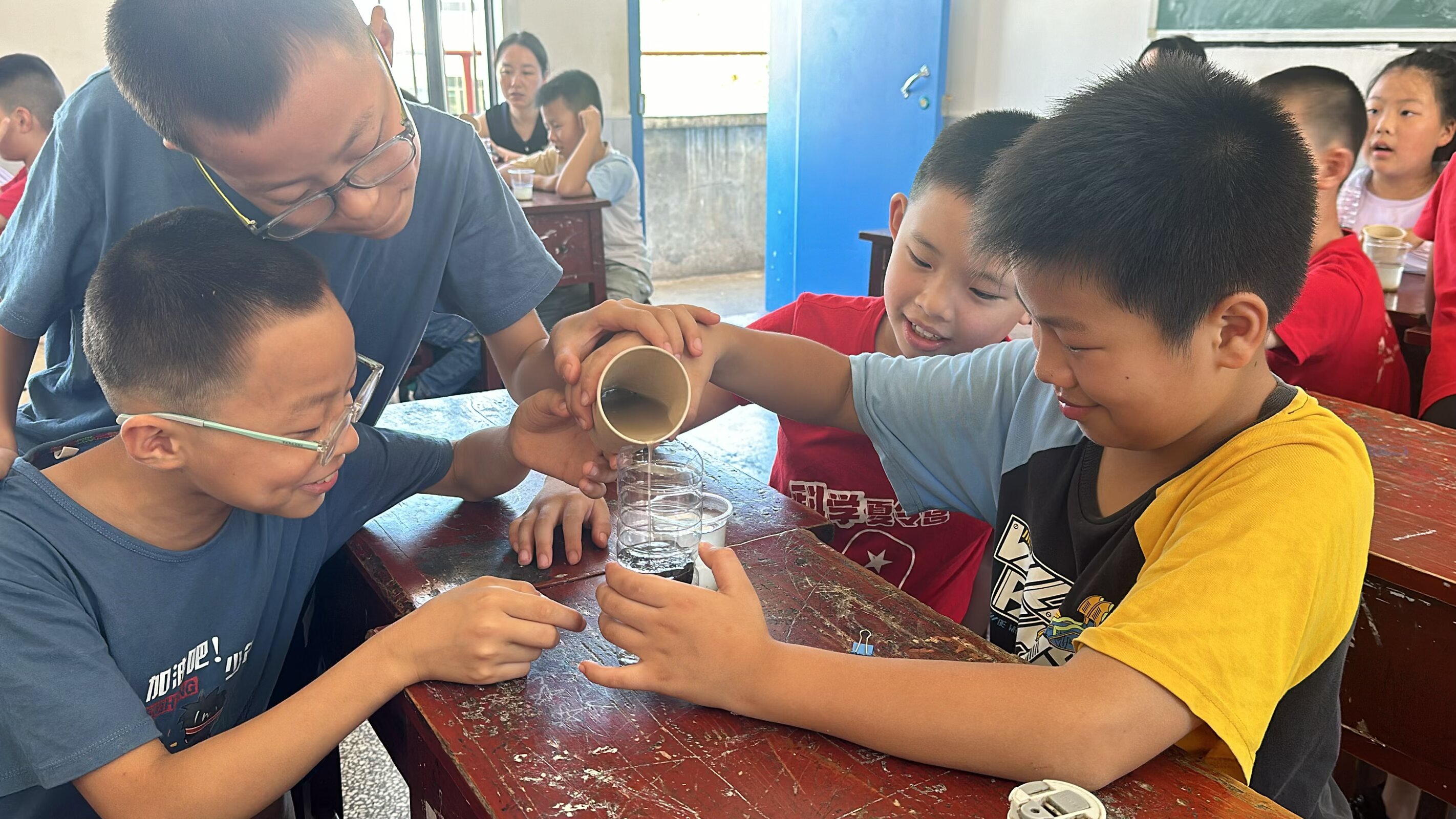 课堂上,一场场有趣的实验带领着学生们探索科学世界,志愿者在讲述实验原理,演示实验过程后,引导学生们分小组按步骤成功完成实验。
