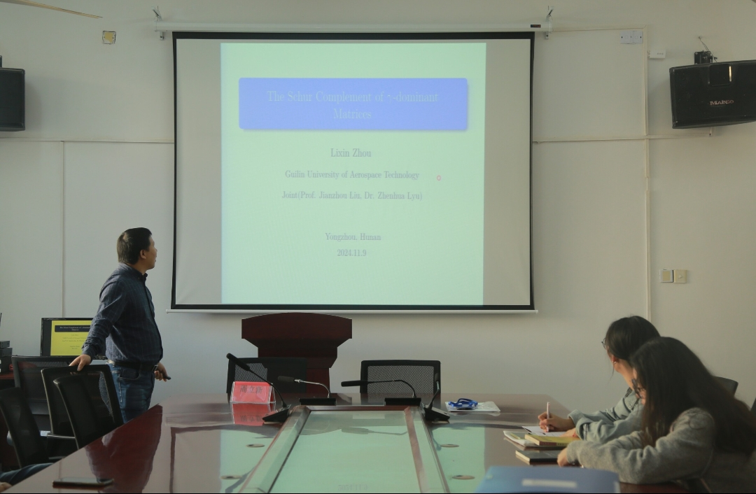 本网讯(通讯员:石庆湘)为了探讨数值代数理论的发展前沿11月9日上午,理学院在明理楼313举行了以“γ占优矩阵的Schur补”为主题的讲座。讲座由桂林航空工业学院周立新教授主讲,理学院副院长周立平、理学院部分老师学生出席。