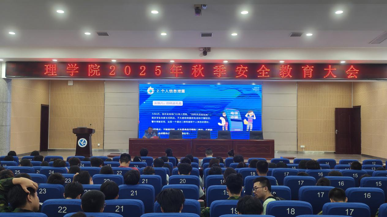 本网讯(通讯员 黄欣欣)9月30日下午,理学院召开2025年秋季安全教育大会,理学院党总支副书记欧阳素勤、2025级新生辅导员龙枚樱、李栋梁警官以及2025级全体新生参加。