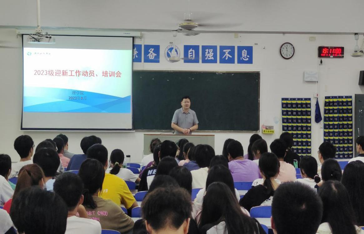 本网讯(通讯员:唐鼎)为确保2023级迎新工作井然有序,为新生提供热情、周到的服务,确保迎新工作顺利完成,理学院于9月5日晚18:50在明理楼302召开了2023级迎新工作动员、培训会。会议由23级新生辅导员赵江南老师主讲,理学院党总支书记唐卫华出席,全体迎新志愿者、新生副班及工作人员参加。