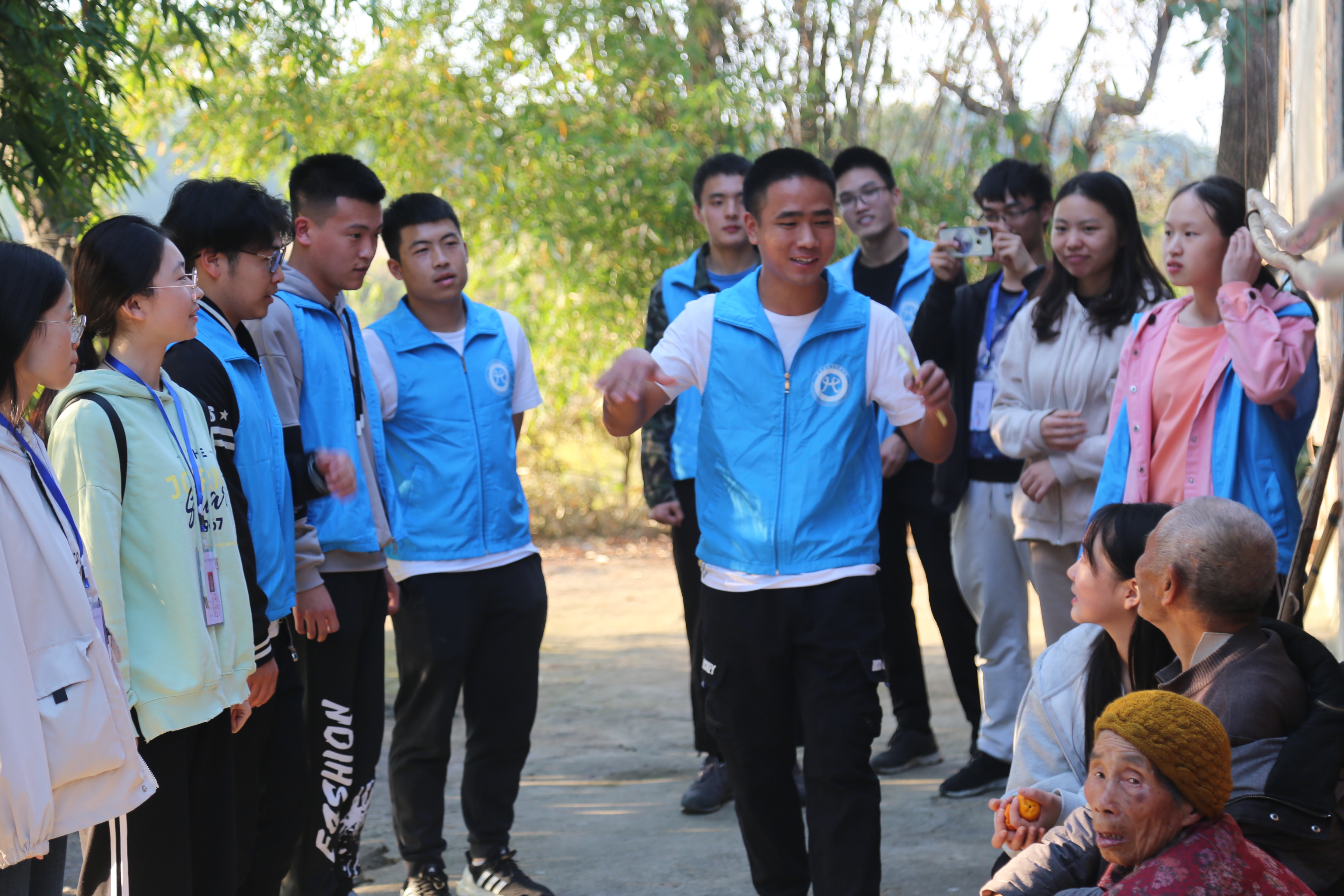 下午3时,志愿者们提着水果、八宝粥、糕点,来到孙志柏老人的家中,帮忙整理房屋和打扫卫生,聆听英雄故事。孙志柏老人14岁参军,曾参与抗日战争,抗美援朝战争,以自己的血肉之躯护祖国安宁,在与同学们回忆当年时,他不禁慷锵有力地唱起了红歌,虽已95岁高龄,但气势不减当年。我们退伍复学的4名志愿者带领全体为孙爷爷献唱《三大纪律八项注意》、《团结就是力量》、《歌唱祖国》等红歌,歌唱结束后用标准的敬礼表达了对英雄的崇高敬意。
