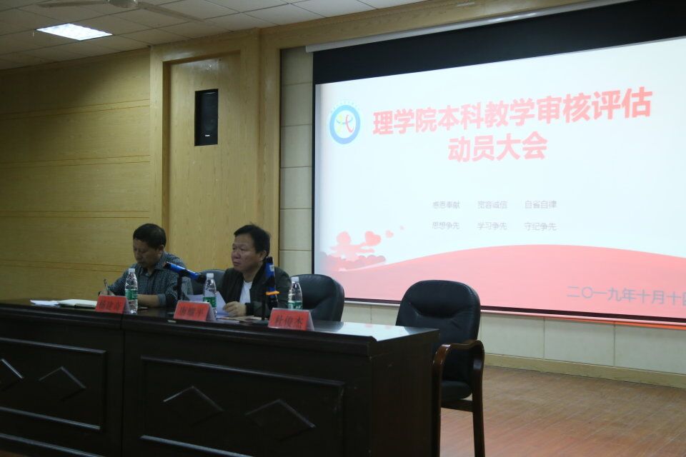 大会伊始,唐耀平对学校前期的评估工作做了简要报告,指明本次教学评估工作目的是“为了审核学校对本科教育工作是否与学校自己的培养目标一致”,肯定了理学院前期为迎接评估工作所做的准备,指出了目前工作中出现的问题。同时,唐耀平对评估后期的冲刺阶段提出了以下三点要求:第一,要求大家要有统一认识,明确审核评估的重要性;第二,要时刻注意细节,确保迎评工作的万无一失,进一步做好教学文档与教学资料的整理;第三,要营造良好的氛围,保持良好的迎评状态。其后,杨建齐发表了讲话,他对全体教师提出了在教风纪律、模课工作、环境卫生、教学检查工作、文明礼仪等九个方面的要求。会议过程中,会场纪律良好,大家都以最认真用心的姿态去准备此次的教学评估活动。