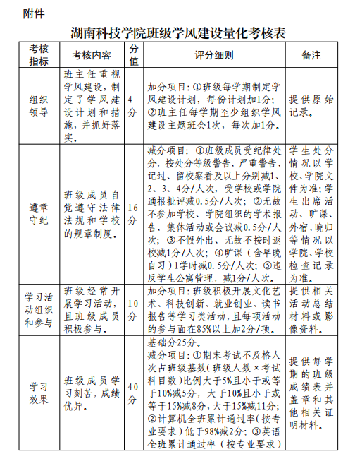 2.学院考核。各教学学院对所属班级进行评价考核,并给出考核结果报学生工作部(处)。
