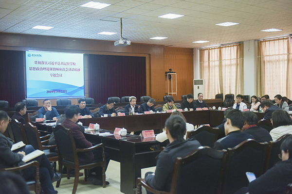 本网讯 (通讯员 聂湖) 3月22日,我校召开学习贯彻习近平总书记在学校思想政治理论课教师座谈会上的重要讲话精神专题会议。党委书记、校长、学校思想政治工作领导小组组长曾宝成,校领导唐艳明、彭立威、李常健、吴小林、程智开及学校思想政治工作领导小组其他成员,马克思主义学院全体教师,各教学学院党总支副书记、全体辅导员,教师教育学院院长等参加会议。会议由党委副书记唐艳明主持。