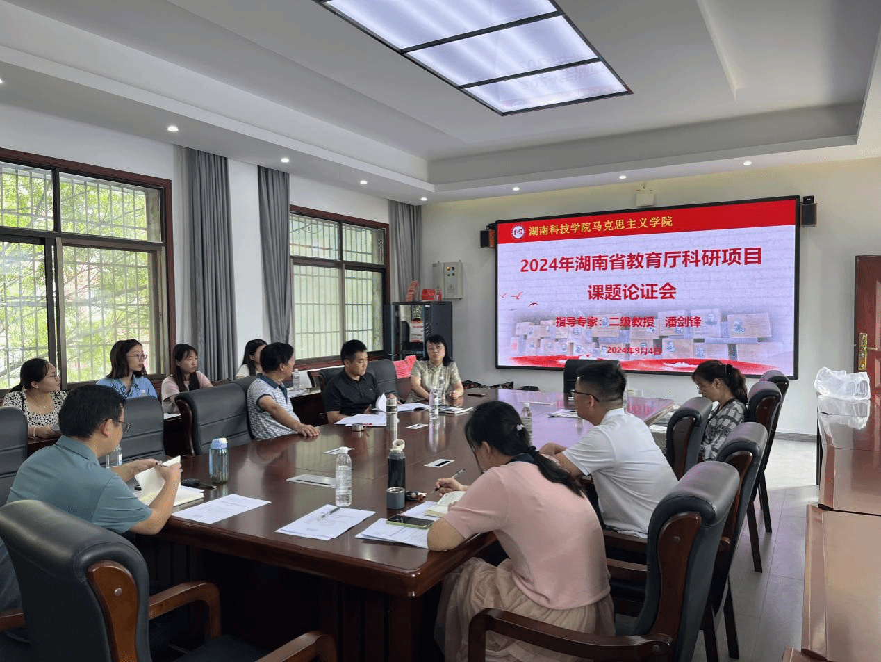 本网讯(记者 符小勇 周勇)9月4日上午,马克思主义学院2024年湖南省教育厅科研项目申报论证会在鹤鸣楼405会议室召开。学院邀请二级教授潘剑锋作现场指导论证,院长廖雅琴、党总支书记陈玉皎、项目申报人和部分青年教师参加会议。