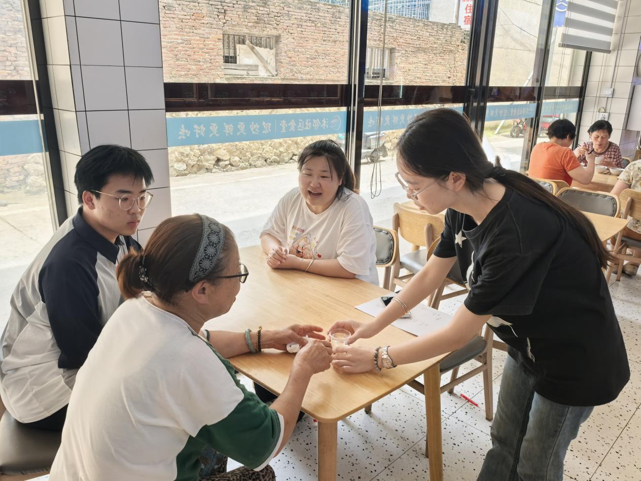 在沐邻社区食堂,团队成员以“老有所养”为切入点,与老人们展开对话。该食堂是湖南沐邻冷链配送有限公司融合社区食堂、老年助餐等功能的创新模式。活动中,曾从事基层新闻报道三十年的周奶奶表示,社区食堂不仅解决了老年人吃饭的难题,更让老年人群体感受到社会的温度。并寄语青年:“希望你们在‘红色筑梦’中始终保持对基层的关怀,用行动传递温暖,为社会治理注入青春力量。”一位零陵师专毕业的老教师感慨道:“看到年轻人用专业知识服务社区,这正是红色精神的代际传承。”