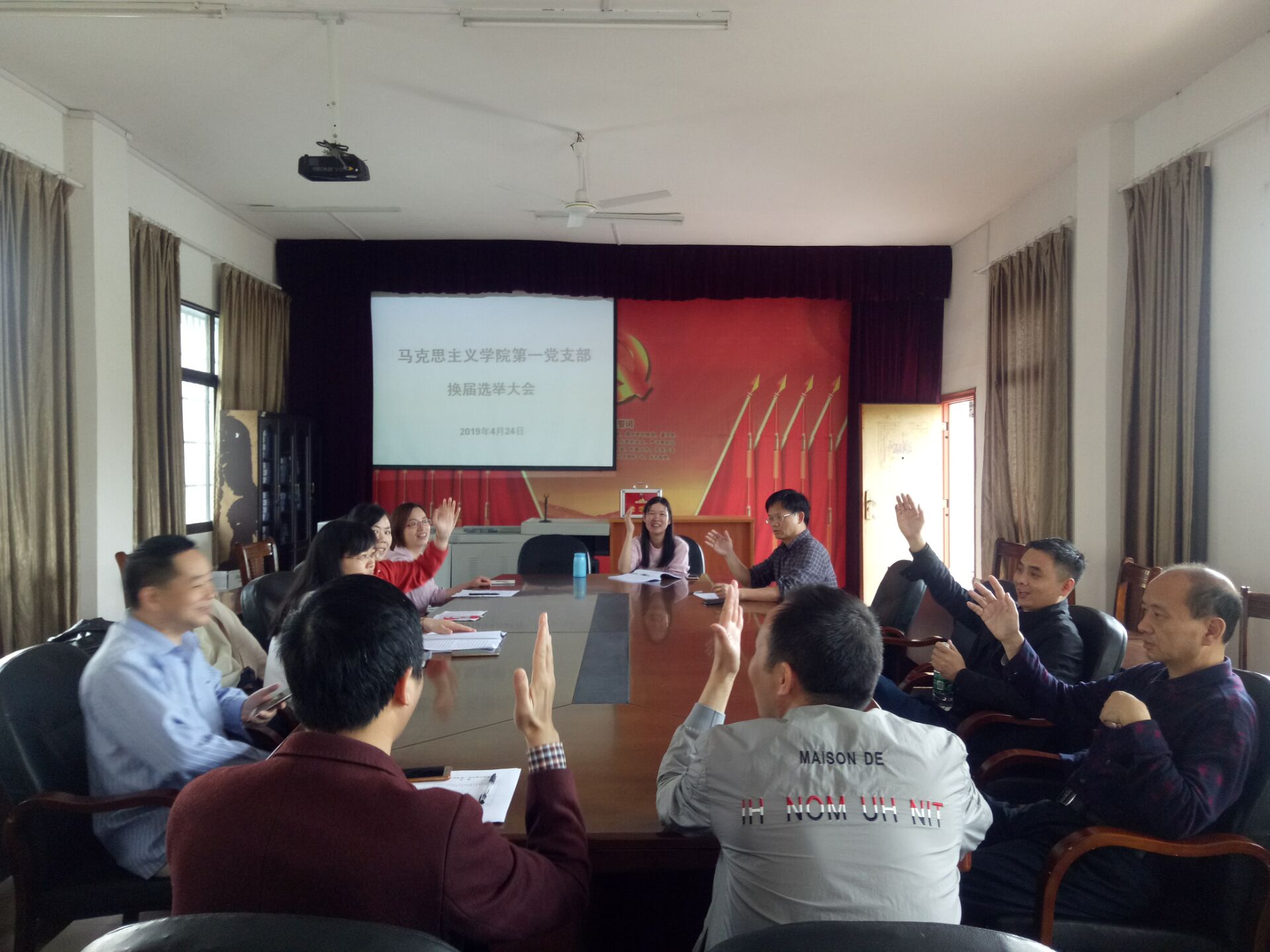 马克思主义学院第一党支部于2019年4月24日在鹤鸣楼405会议室召开换届选举大会。本党支部共有党员13名,因事请假2名,参会党员11人。
