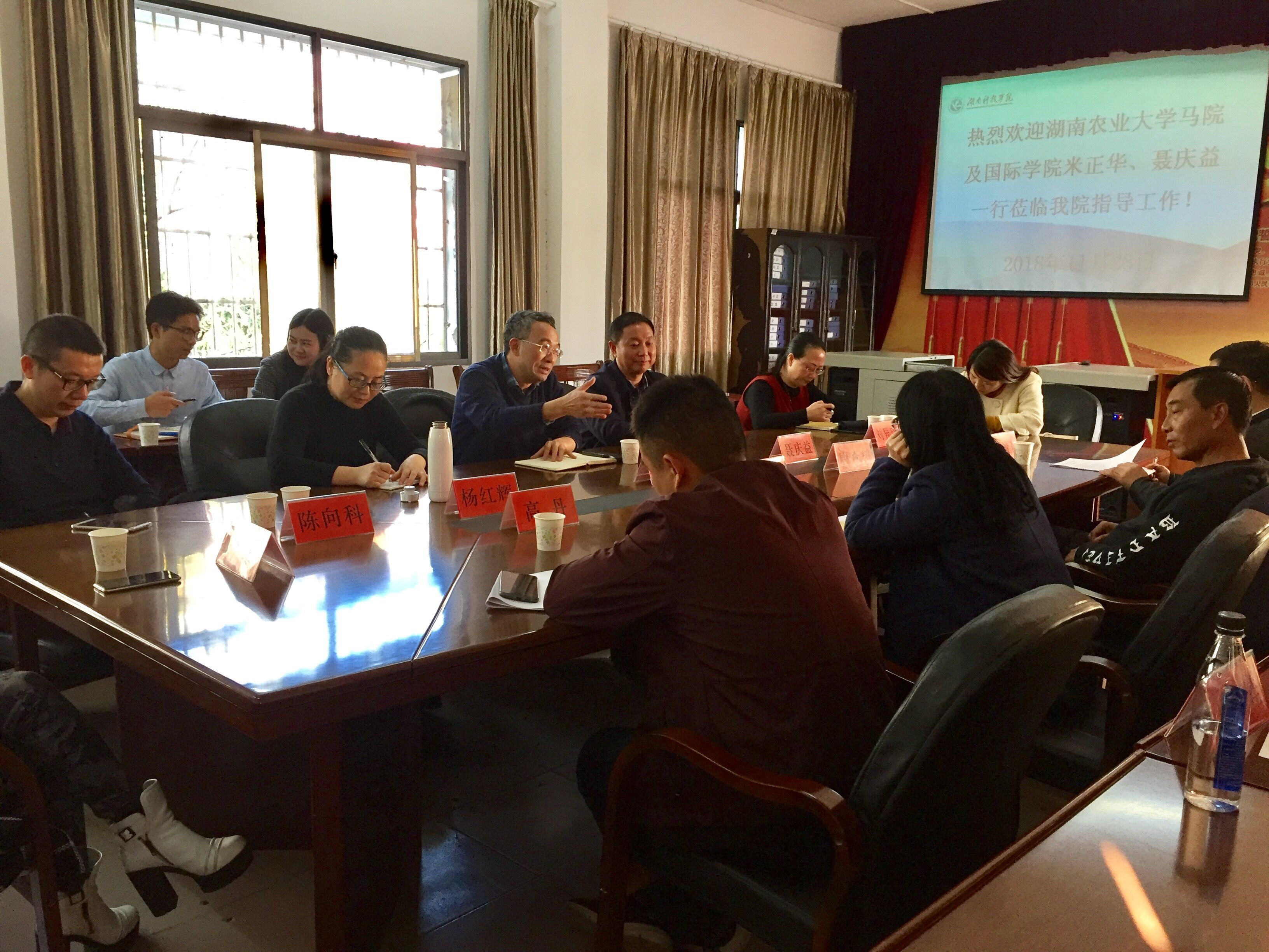本网讯 (通讯员 李艳)11月28日下午,湖南农业大学马克思主义学院党委书记米正华及国际学院党委书记聂庆益一行9人来校就党建工作及党支部“五化“建设进行考察交流。马克思主义学院党总支班子成员及相关党支部委员参加交流。