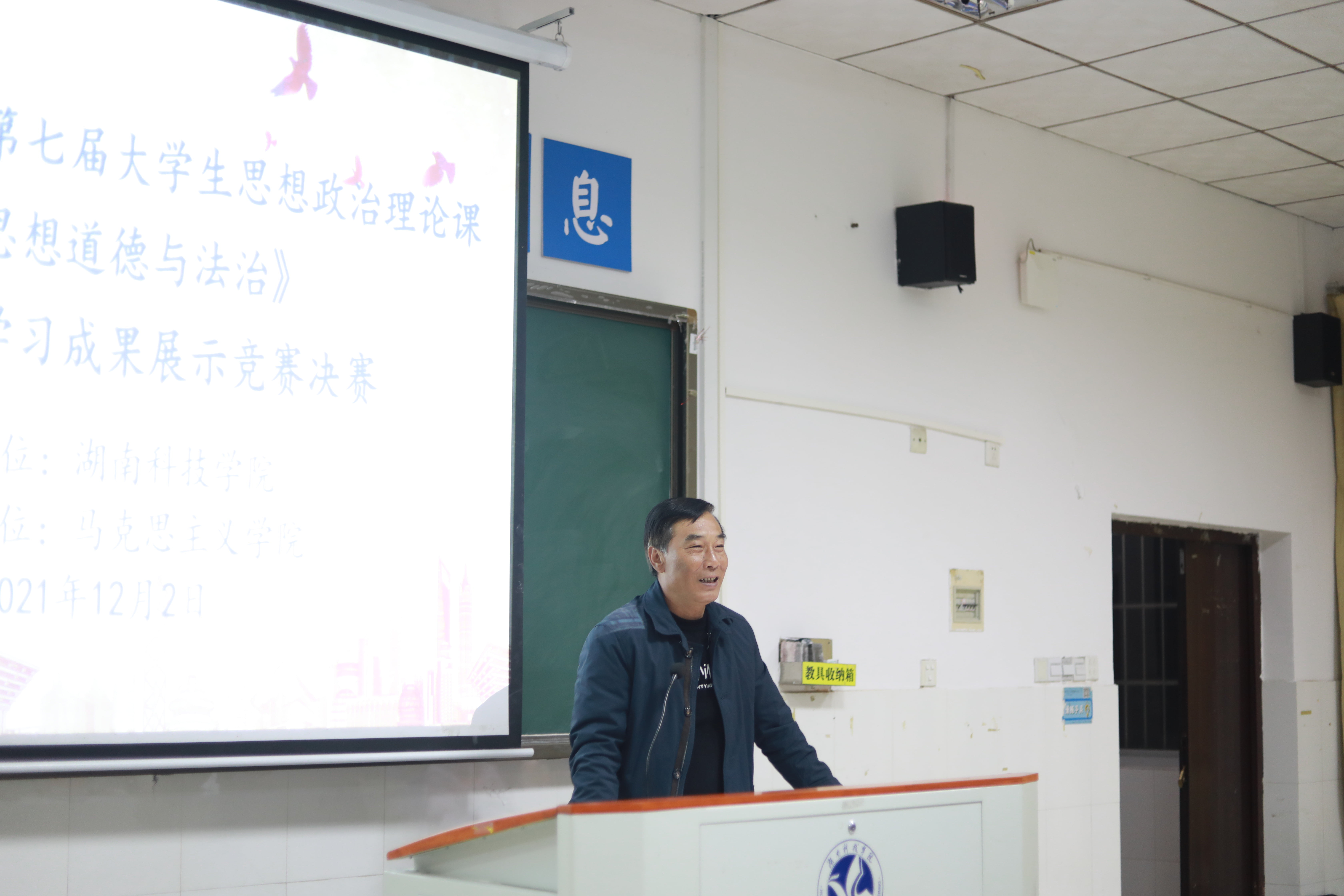 本网讯(记者 张一帆)“我们要加强对《思想道德与法治》的学习,坚持以道德滋养法治精神,有效推进全面依法治国。”12月2日晚,由8868官方网站主办,马克思主义学院承办的第七届大学生思想政治理论课——《思想道德与法治》研究性学习成果展示竞赛决赛于逸夫楼101教室举行。马克思主义学院专职组织员唐森树、党总支副书记兼副院长高丹、副院长李定坤担任评委。