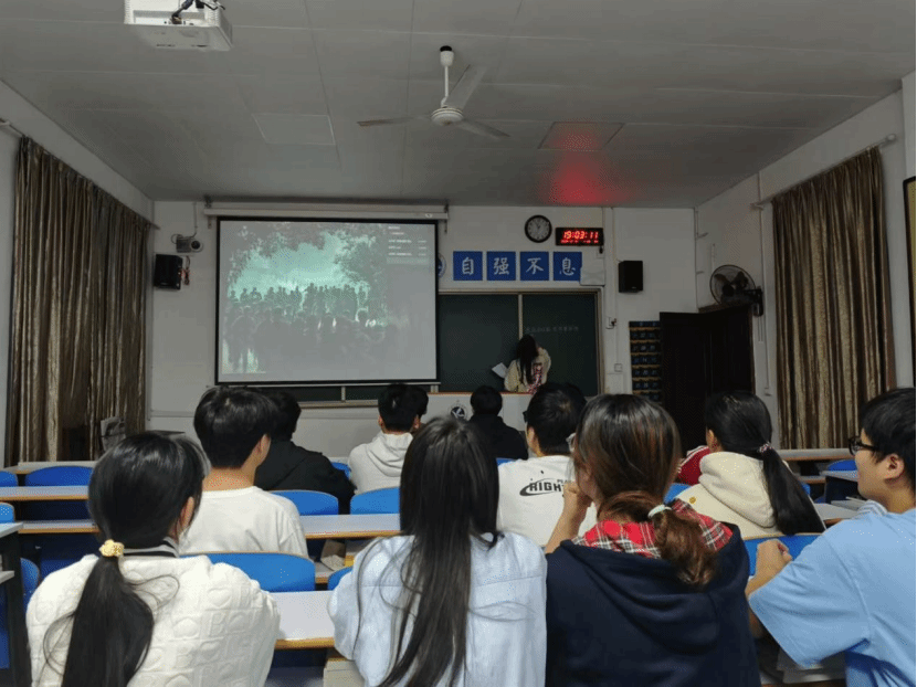 活动前,工作人员分发了湘江战役相关资料,帮助同学们了解长征背景,随后集体观看了长征主题电影《湘江战役》。