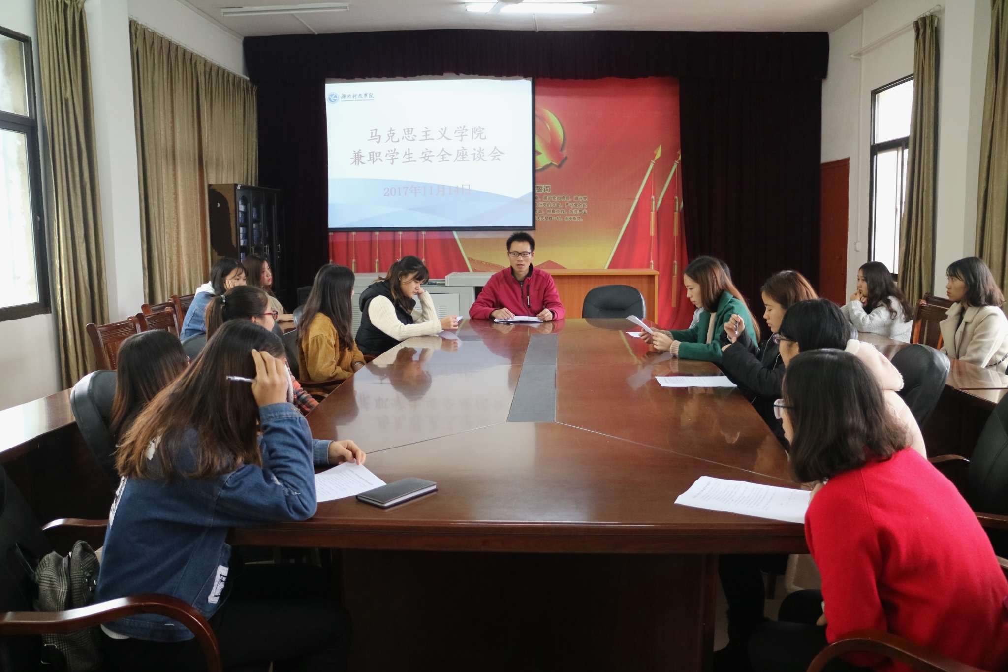 本网讯(通讯员 彭超)为提升我院兼职学生的安全意识,11月14日下午,兼职的学生在鹤鸣楼405会议室参加兼职学生安全座谈会。该会由马克思主义学院学工办主任全伟老师主持。