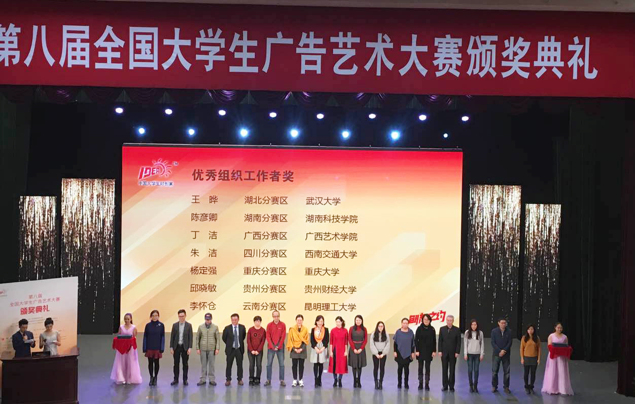 2016年11月27日,教育部学科竞赛第八届全国大学生广告艺术大赛颁奖典礼暨第九届全国大学生广告艺术大赛启动仪式在全国政协礼堂隆重举行,全国千名嘉宾代表、获奖师生齐聚北京,共襄盛举。据悉,该赛事历经5个月的角逐,全国2311所院校80万学生参赛、36万件参赛作品参评, 大赛竞争异常激烈。我校美术与艺术设计学院积极备战,成功举办了第八届全国大学生广告艺术大赛8868官方网站选拨赛;分别邀请了相关命题企业单位(披萨星球市场部经理、iH5市场总监)及学界专家到校宣讲选题和专题辅导。在此次大赛中美术与艺术设计学院学生严丹、赵铭钰创作的平面类作品《艾丽的舞蹈》获国家级三等奖,另外还有1项平面类作品和3项视频类作品荣获国家级优秀奖。此外,在湖南赛区,我校共获得4项一等奖,9项二等奖、12项三等奖、8项优秀奖的优异成绩,同时我校还获得“湖南省分赛区优秀组织奖”,陈彦卿副教授也光荣地获得了“全国优秀组织工作者”的荣誉,各类奖项均创下历史最好记录。