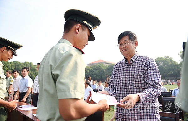 本网讯(记者 欧盼迪 摄影 何帅文)9月23日上午,新生军训总结表彰大会在田径场举行。名誉校长、杰出校友、中国工程院院士欧阳晓平及全体在家校领导出席,武警永州市支队教导员陈圣成中校,武警永州市支队大队长周昌祥少校在主席台就坐。大会由副校长宋宏福主持。