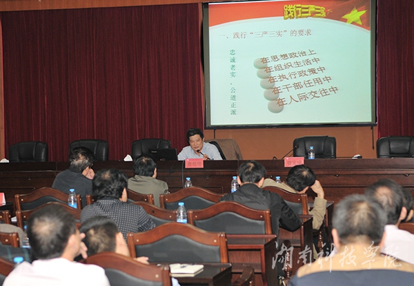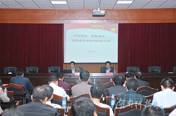 本网讯(记者 阳新秀)10月13日晚,学校在行政办公楼八楼会议室开展“三严三实”专题教育 “严以用权”专题培训。校长曾宝成主持并讲话。校党委副书记唐艳明作主题为“严以用权,真抓实干,做忠诚干净担当的好干部”的专题学习辅导报告。