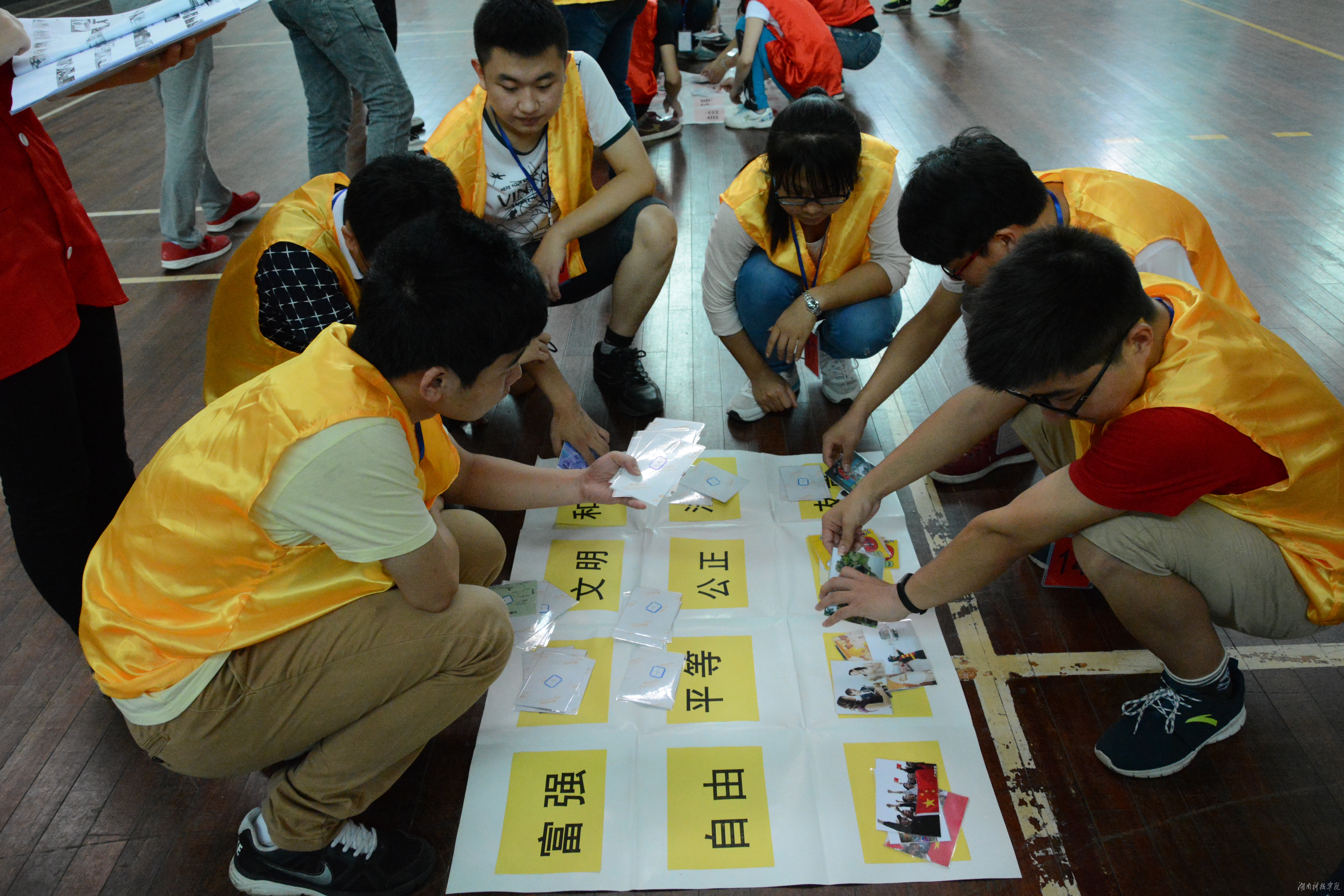 在“核心价值观践行”环节,每队队员往指定的盒子里投球,在进球的情况下一对一换取图片,按照自己的理解把图片放在对应的核心价值观方框内,然后对放错的图片进行分享。