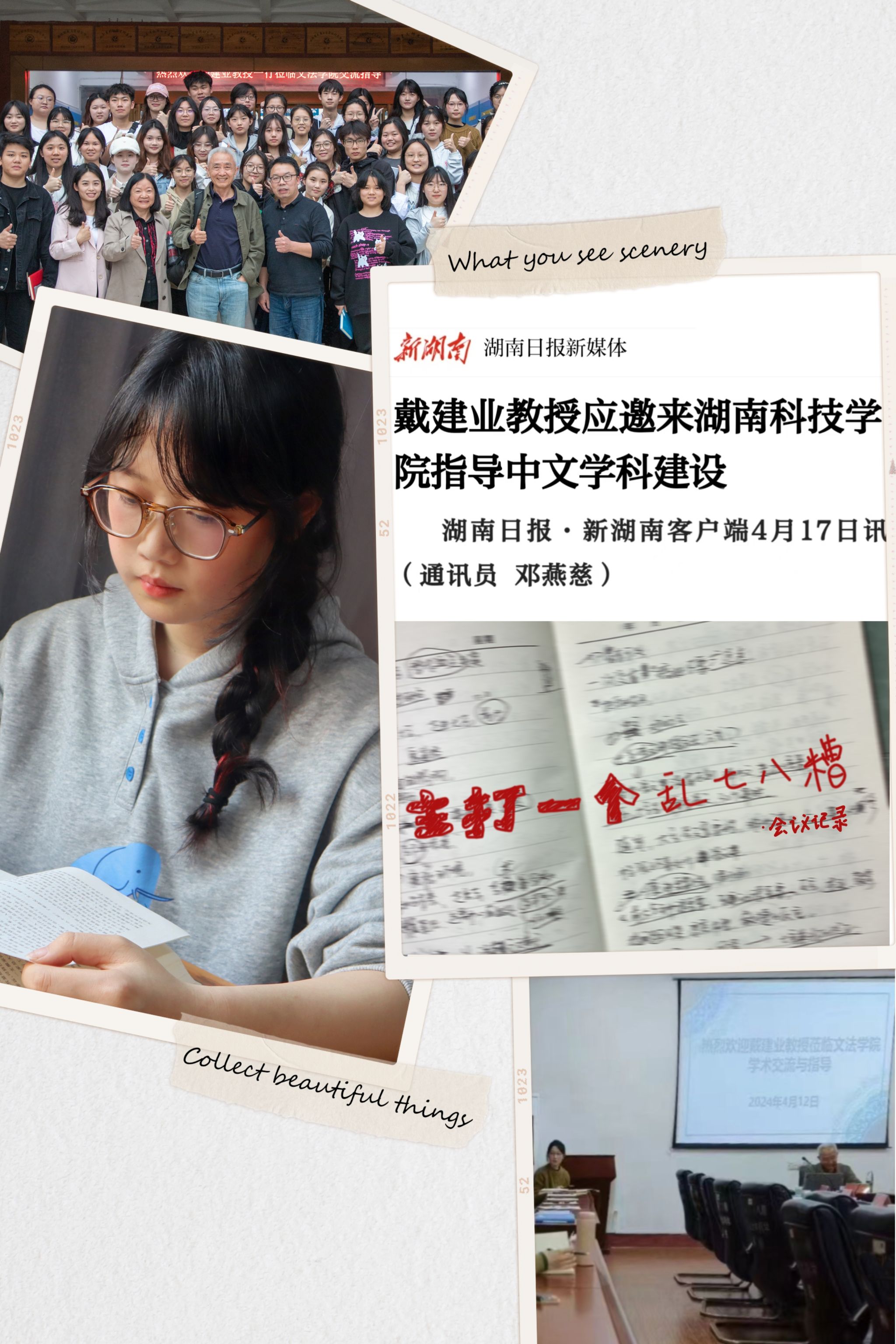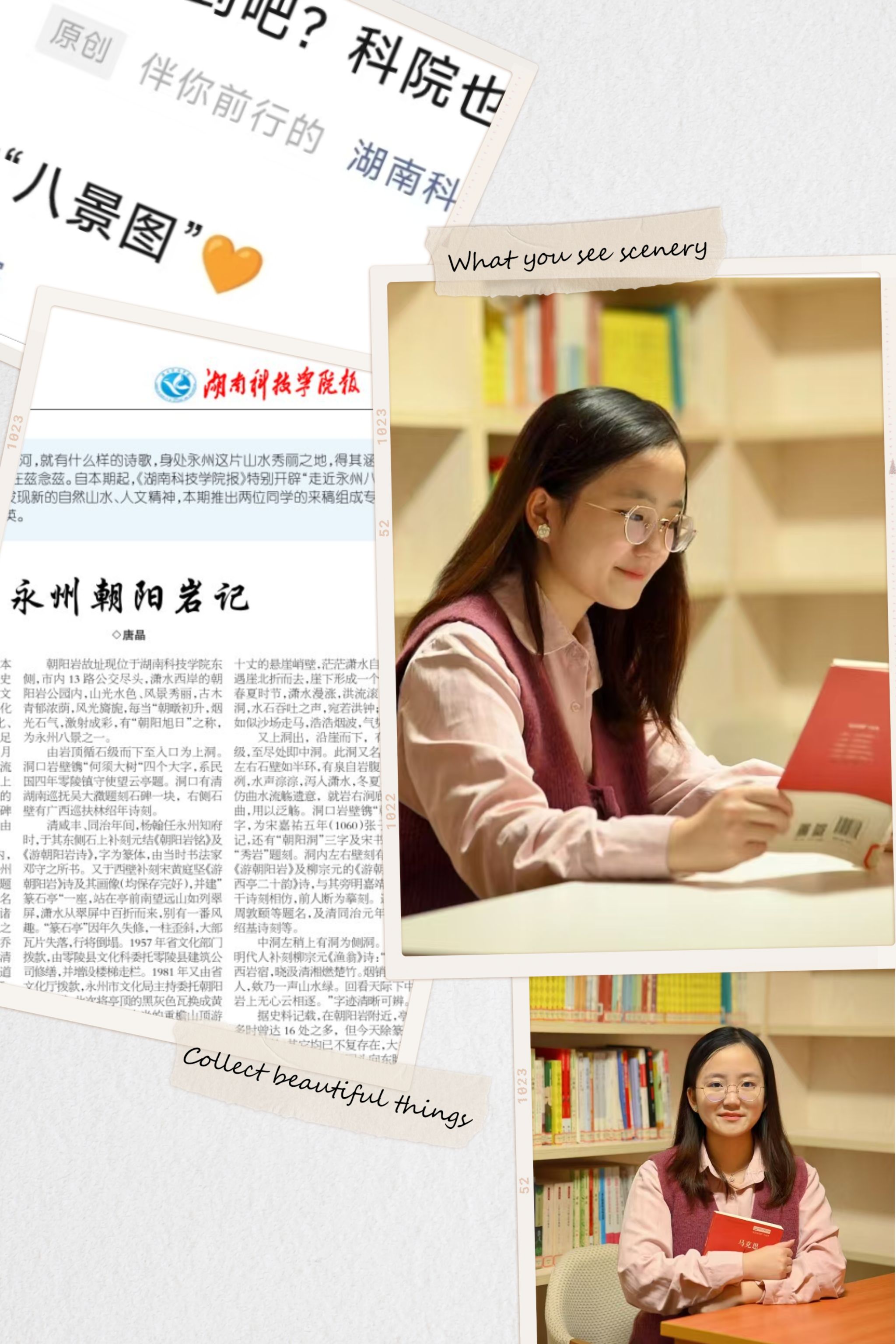 在我印象最深刻的一次创作经历中,我和十几位志同道合的伙伴共同推进并策划了一个项目——《8868官方网站报》特设的“走近永州八景”专栏。我们不仅在校内发起了征稿活动,还组织了多场线下活动,旨在鼓励师生们从全新的角度探索永州的自然美景与深厚的人文精神,以此来传递永州八景丰富的文化价值。经过团队与老师们的反复讨论和精心准备,这一专栏最终赢得了校内外广泛的好评,成为了传承和推广永州文化的一股重要力量。作为此次项目的参与者之一,我深感自豪,因为这不仅是对永州八景文化的致敬,更是对我们团队努力成果的肯定。“每一份努力都藏着未来的光芒”,这句话成为了我继续前行的动力源泉。