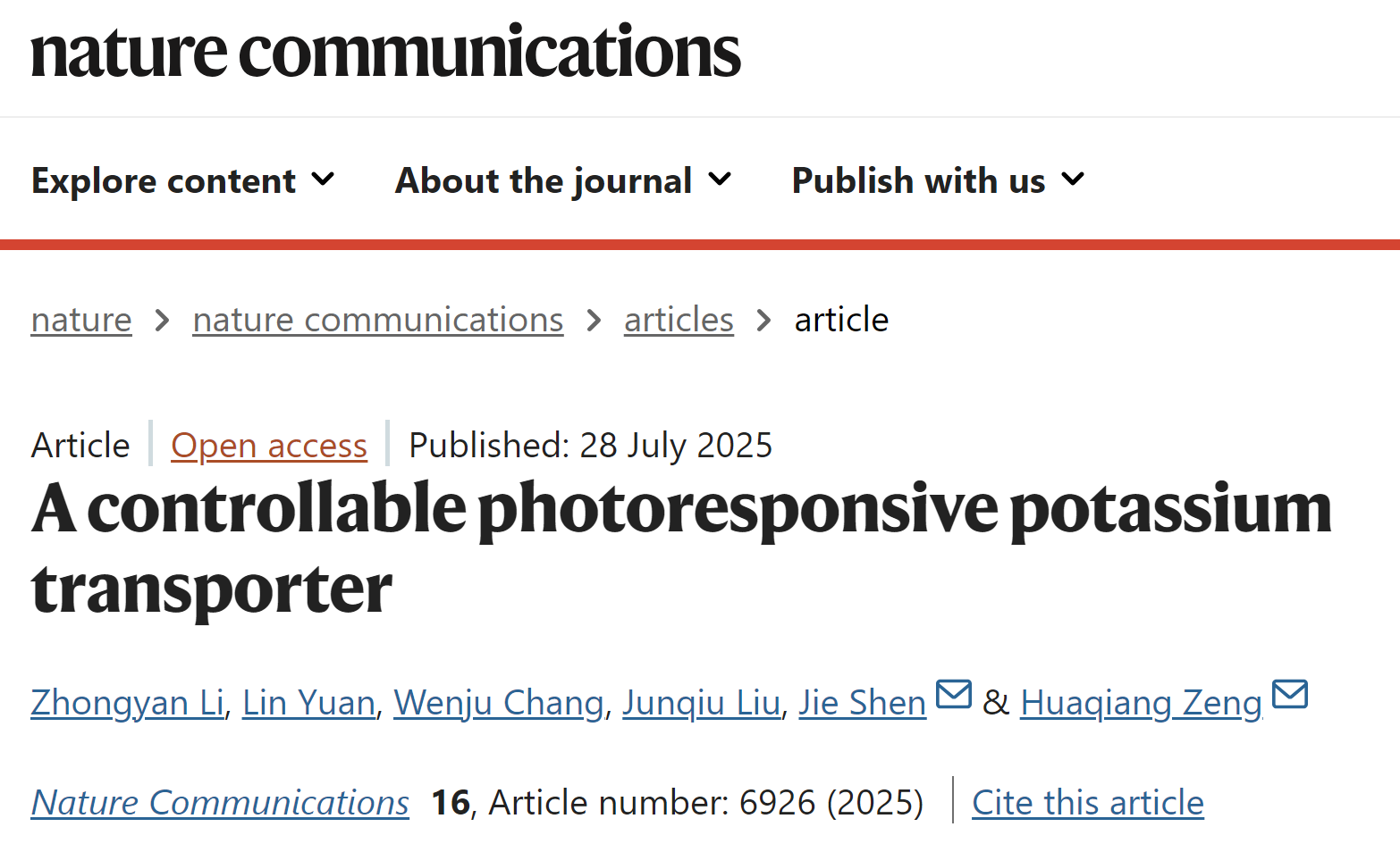 本网讯(通讯员 袁志辉)7月28日,我校袁霖教授团队与福州大学曾华强教授、沈杰教授团队合作,在国际知名学术期刊《Nature Communications》上发表题为《A controllable photoresponsive potassium transporter》的研究论文,我校为第二署名单位,论文第一作者为我校进修攻读博士学位的李中燕老师、第二作者为袁霖教授。这是我校再次在Nature子刊上合作发表研究文章。