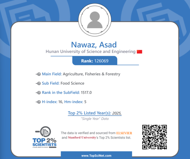 本网讯(通讯员 袁志辉 李尊华)近日,美国斯坦福大学发布了2025年度“全球前2%顶尖科学家榜单”(World's Top 2% Scientists 2025),我校化学与生物工程学院谢龙勇博士与Asad Nawaz博士同时入选该榜单,进入所在学科综合影响力世界前2%,其中,谢龙勇博士自2020-2023年已连续多年入围该榜单,Asad Nawaz博士排名全球食品科学家第1517名。