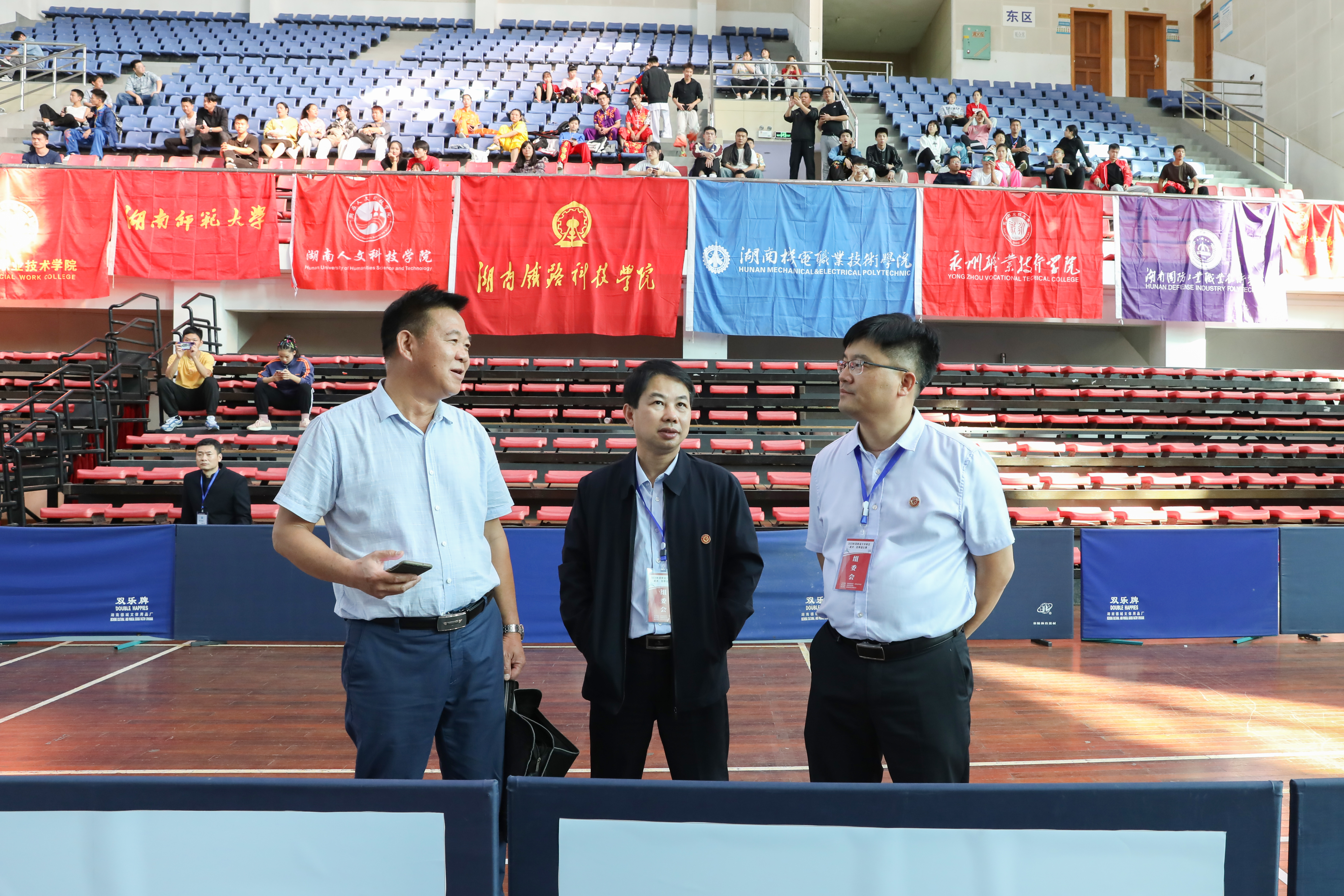 本网讯 11月19日,2020年湖南省大中学生武术、跆拳道比赛在我校正式开赛。当天下午,校长李钢、副校长李常健一行来到体育馆,观摩正在进行的武术比赛。