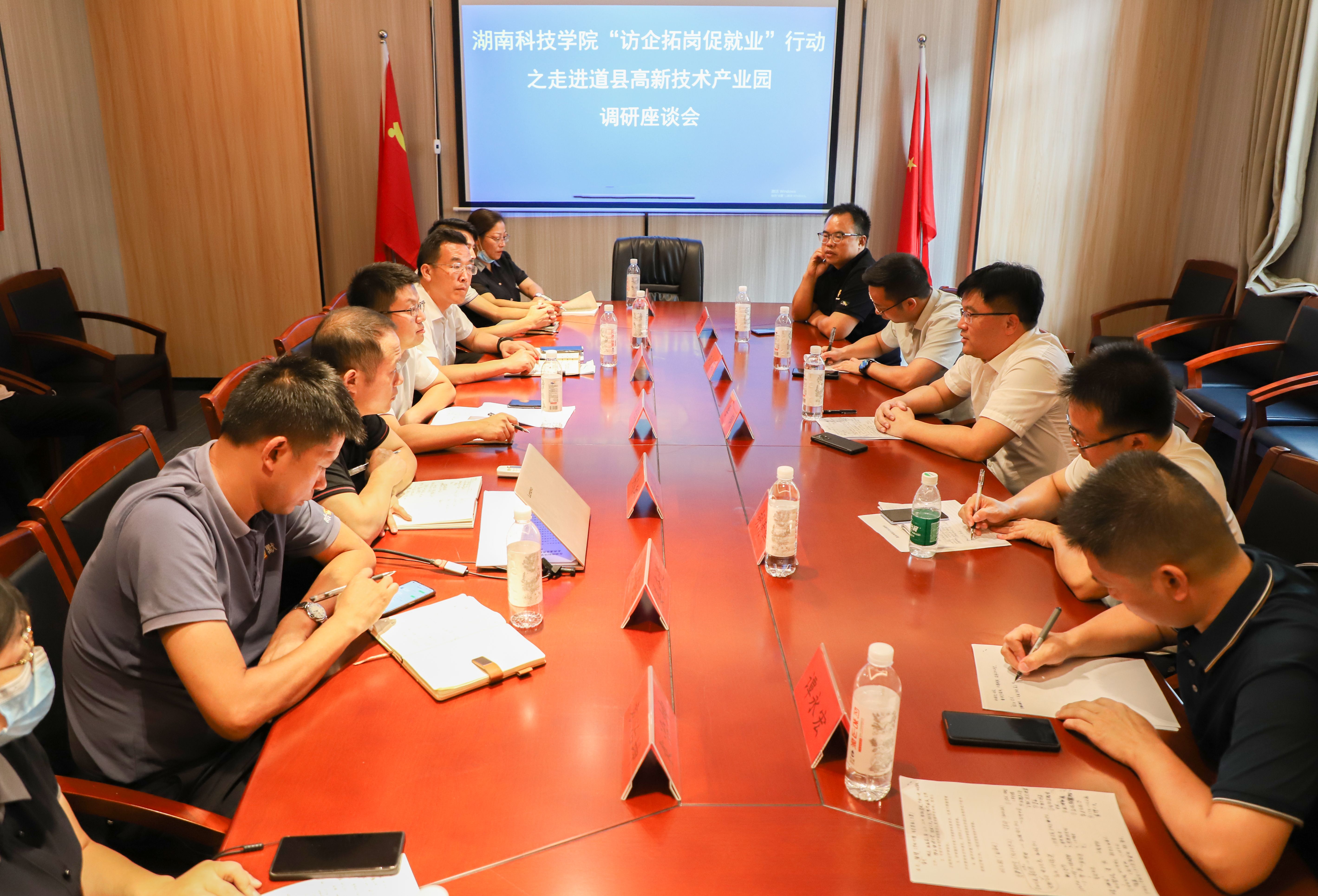 本网讯(记者 余佳佳)9月19日,校长李钢带队赴道县高新技术产业园开展访企拓岗促就业专项行动,与相关企业代表就校地校企合作、毕业生高质量就业、人才培养等问题进行深入交流。道县县委常委、副县长胡云超,道县高新技术产业开发区党工委书记乌翔宇出席交流座谈会。
