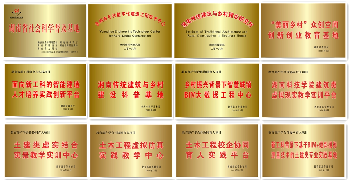 学院现有各类仪器设备价值一千余万元,包括探地雷达测试系统、飞马无人机、大疆无人机、法如三维激光扫描仪、GPS接收机、微机屏显式液压万能试验机等设备。拥有湖南省古建筑文化遗产保护传承社会科学普及基地、湖南省优秀校外实习基地、湖南省校企合作“美丽乡村”众创空间创新创业教育基地等多个省级实践教学基地,拥有BIM技术研发中心、8868官方网站湘南传统建筑与乡村建设研究所、永州市“乡村数字化建造工程技术中心”、永州市“湘南传统建筑科普基地”以及教育部协同育人“乡村振兴背景下智慧城镇BIM大数据工程中心”等实践中心。学院注重与社会多方合作办学、协同育人,与中铁、中交以及湖南建工集团等企业签署了校企合作协议;先后与广州、深圳、长沙、杭州多家知名企业建立校外实习基地、创客中心等人才培养基地。