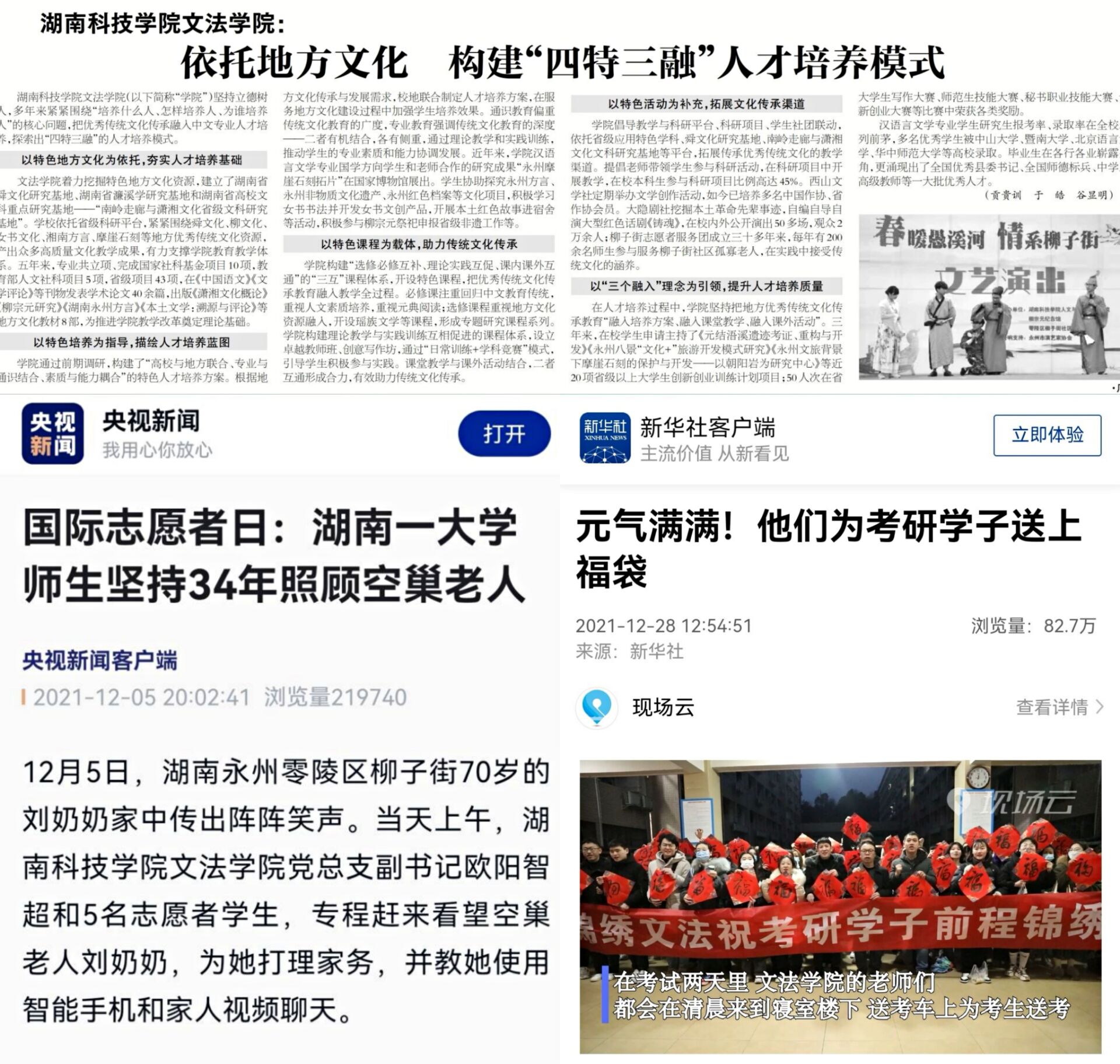 多层次、多种类的平台,为学生成长提供了个性化的成长空间,学生不仅可以学习专业知识,还可以在老师的带领下开展科学研究、探索未知领域。近五年来,立项省大学生研究性学习和创新性实践项目30余项,学生发表学术论文(作品) 100余篇,出版长篇小说5部、散文集1部。在校学生在学科专业竞赛中获奖60余项,其中全国商务秘书技能大赛、省写作大赛、省模拟法庭一等奖等10余项。立项省级创新创业项目30余项,其中荣获湖南省大学生创业大赛银奖、铜奖各1项,“互联网+” 湖南省大学生创新创业大赛二等奖2项、三等奖2项。