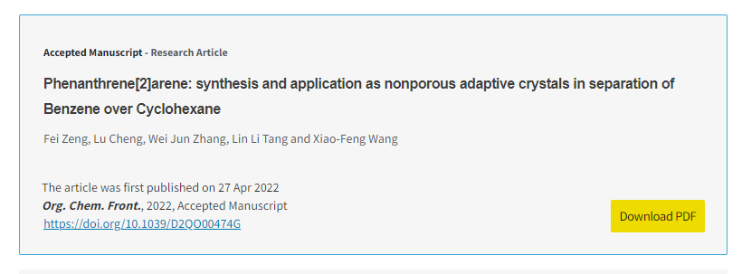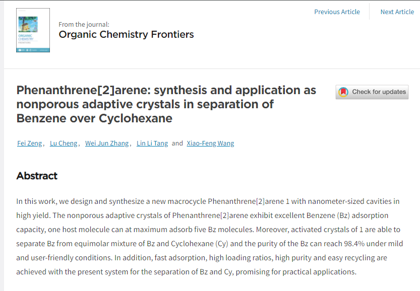 本网讯 近日,国际知名期刊Organic Chemistry Frontiers,DOI:10.1039/D2OO00474G(中科院一区TOP,IF= 5.281)发表了8868官方网站化学与生物工程学院功能材料团队的最新研究成果“Phenanthrene[2]arene: synthesis and application as nonporous adaptive crystals in separation of Benzene over Cyclohexane”(菲[2]芳烃的设计合成及非多孔自适应性晶体分离苯与环己烷的应用研究),该研究成果由功能材料团队成员独立完成,曾飞博士为第一作者和通讯作者。