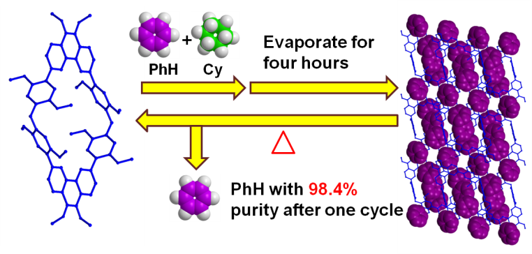 在此基础上,研究团队以菲为构筑单元,在三氟化硼乙醚溶液催化下高产率(72%)合成了具有纳米空腔的菲[2]芳烃。气体吸附实验发现,1分子的菲[2]芳烃可以吸附5个苯环分子,这是目前已报道类似化合物对苯环分子的最大吸附值的2.5倍(文献报道的最大值为1分子主体可以吸附2个苯环分子)。此外,活化的菲[2]芳烃晶体可以从苯和环己烷的等摩尔混合物中选择性分离出苯分子, 纯度高达98.4%,且可以重复多次利用。相比传统的苯和环己烷分离技术,该方法具有节能环保、高吸附量、吸附速度快、可重复利用、分离纯度高等优点,在化工和石化行业中具有巨大的应用前景。该研究获得了国家自然科学基金、湖南省自然科学基金,8868官方网站化学工程与技术应用特色学科等经费支持。