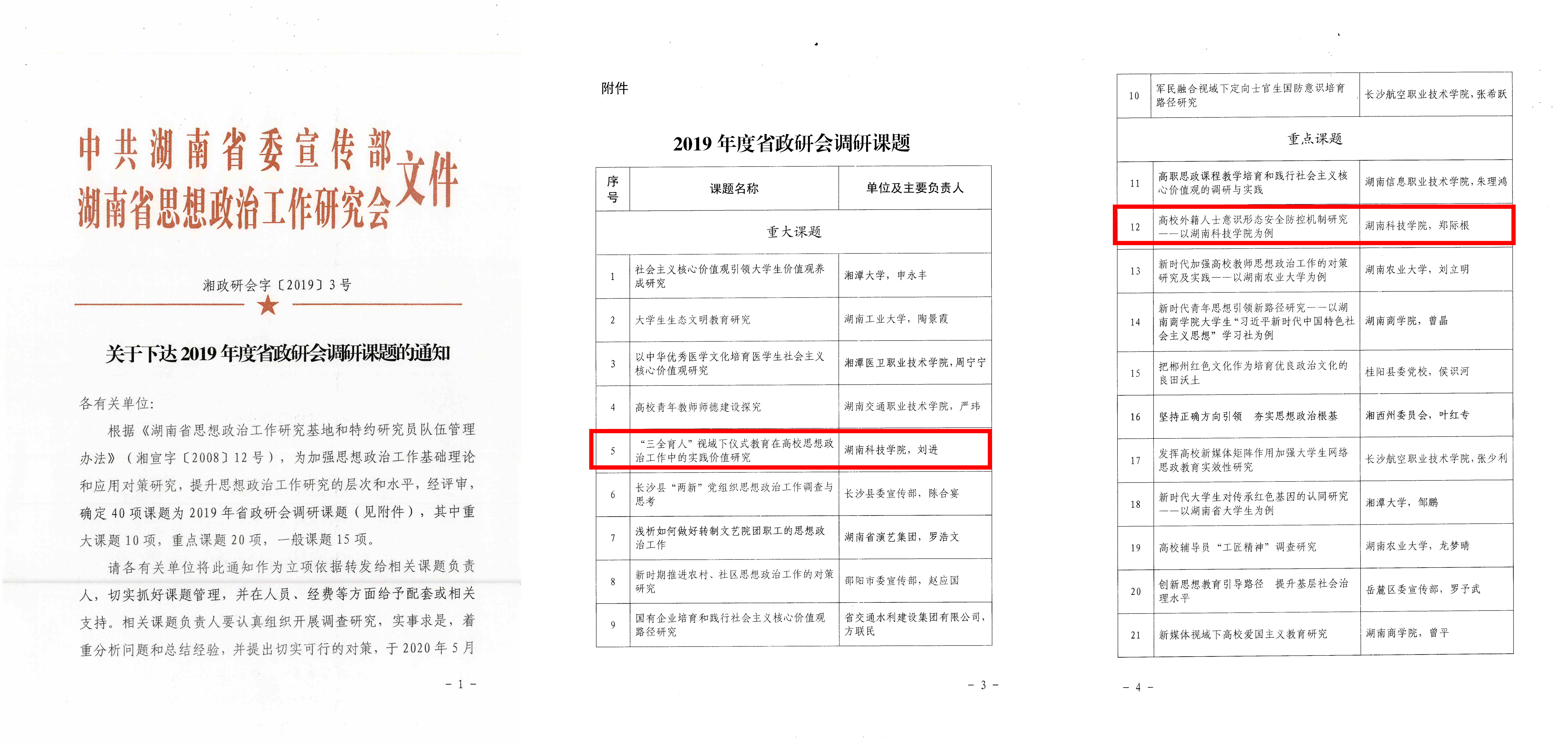 本网讯 12月23日,中共湖南省委宣传部、湖南省思想政治工作研究会发布《关于下达2019年度省政研会调研课题的通知》,我校旅游与文化产业学院教师刘进申报的《“三全育人”视域下仪式教育在高校思想政治工作中的实践价值研究》获重大课题立项,国际交流与合作处处长郑际根申报的《高校外籍人士意识形态安全防控机制研究——以8868官方网站为例》获重点课题立项。