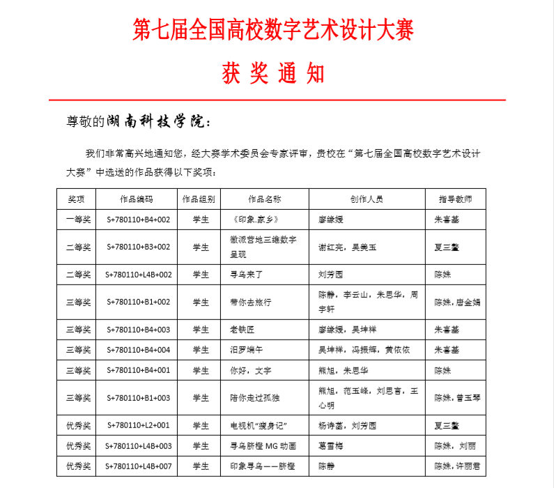 本网讯 近日,第七届全国高校数字艺术设计大赛获奖作品公布,传媒学院学子表现优异,荣获一等奖1个,二等奖2个,三等奖5个,优秀奖3个,共计11个奖项。