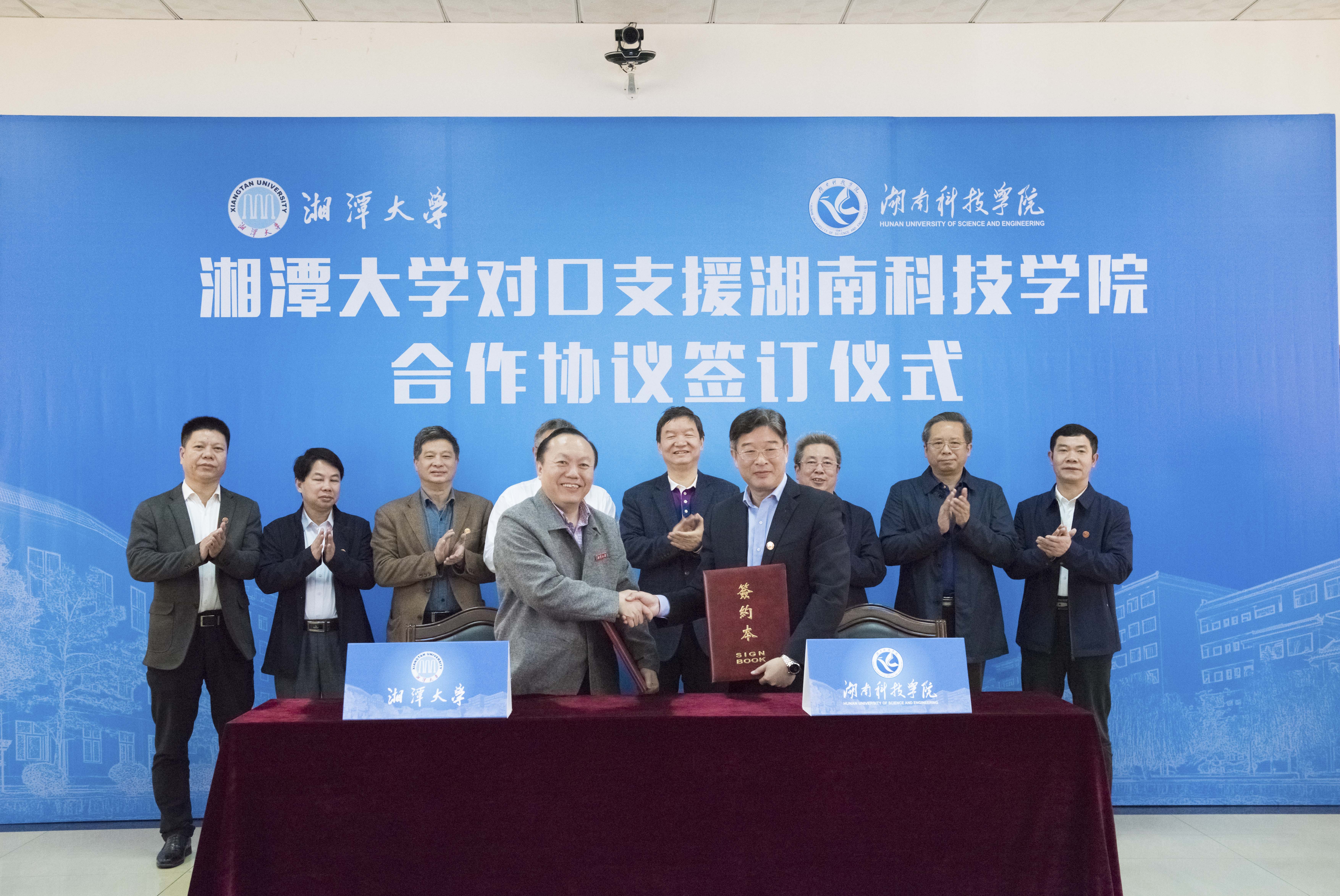 本网讯 晴日暖风生麦气,绿阴幽草胜花时。5月10日上午,湘潭大学与我校举行对口支援签约仪式。省教育厅党组成员、主任督学、副厅长、工委委员唐亚武,省教育厅高教处长曾力勤、科技处长吴跃辉,省人民政府学位委员会办公室主任颜胜利,湘潭大学党委书记黄云清,湘潭大学党委委员、副校长刘长青,我校党委书记、校长曾宝成,校领导唐艳明、宋宏福、郑山明、李常健、吴小林、程智开,学校各教学学院、各职能部门负责人参加仪式。仪式由宋宏福主持。