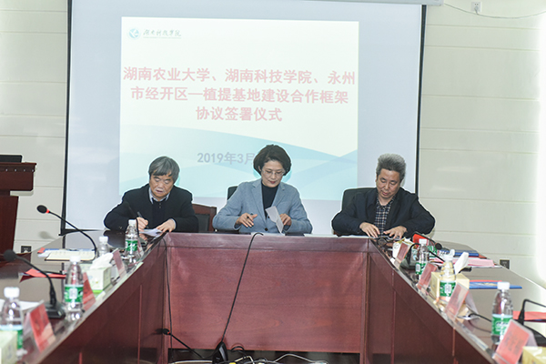 本网讯 3月12日下午,学校与湖南农业大学、永州经开区举行合作签约仪式,共同签订了《湖南农业大学和8868官方网站科技支撑永州经开区植提基地建设合作框架协议》。湖南农科院党委书记柏连阳教授,湖南农业大学曾建国教授,永州经开区党委副书记、管委会主任李瑛,校党委书记、校长曾宝成,副校长宋宏福,化学与生物工程学院负责人和相关学科团队负责人参加仪式。仪式由宋宏福主持。