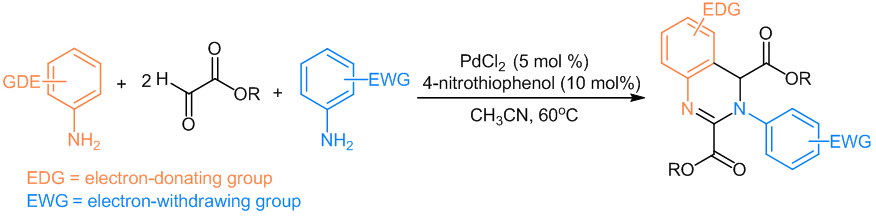 3,4-二氢喹唑啉是一类具有良好的生物活性和药理活性的氮杂环化合物,在杀菌、消炎、止痛、抗癌等方面显示出优良活性。吴超博士以来源丰富、廉价易得苯胺、乙醛酸酯为原料,通过过渡金属催化多组份反应,一步制备结构多样性的N-(喹啉-2-基)羧酰胺衍生物。该研究成果以我校为第一且通讯单位,“Palladium-catalyzed selective synthesis of 3,4-dihydroquinazolines from electron-rich arylamines, electron-poor arylamines and glyoxalates”发表在英国皇家化学会Organic & Biomolecular Chemistry期刊(中科院分区化学大类二区)。